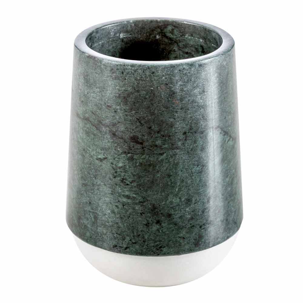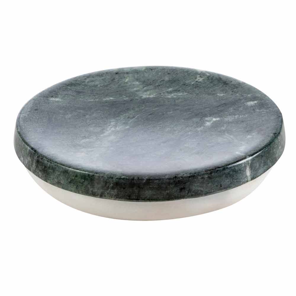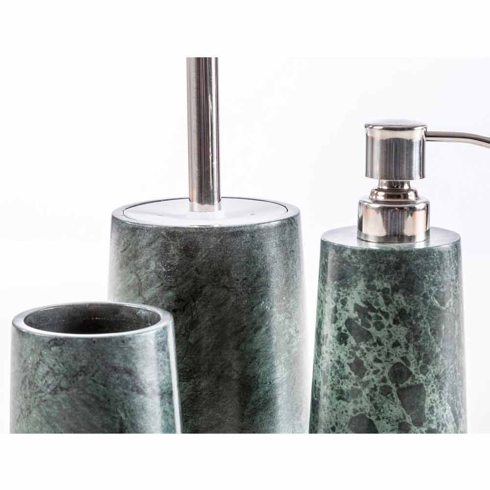 Bombei ist das Badezimmer-Accessoires-Set aus grün gesprenkeltem Marmor, reich an Adern, das auf einem Sockel aus Calacatta-Marmor ruht.