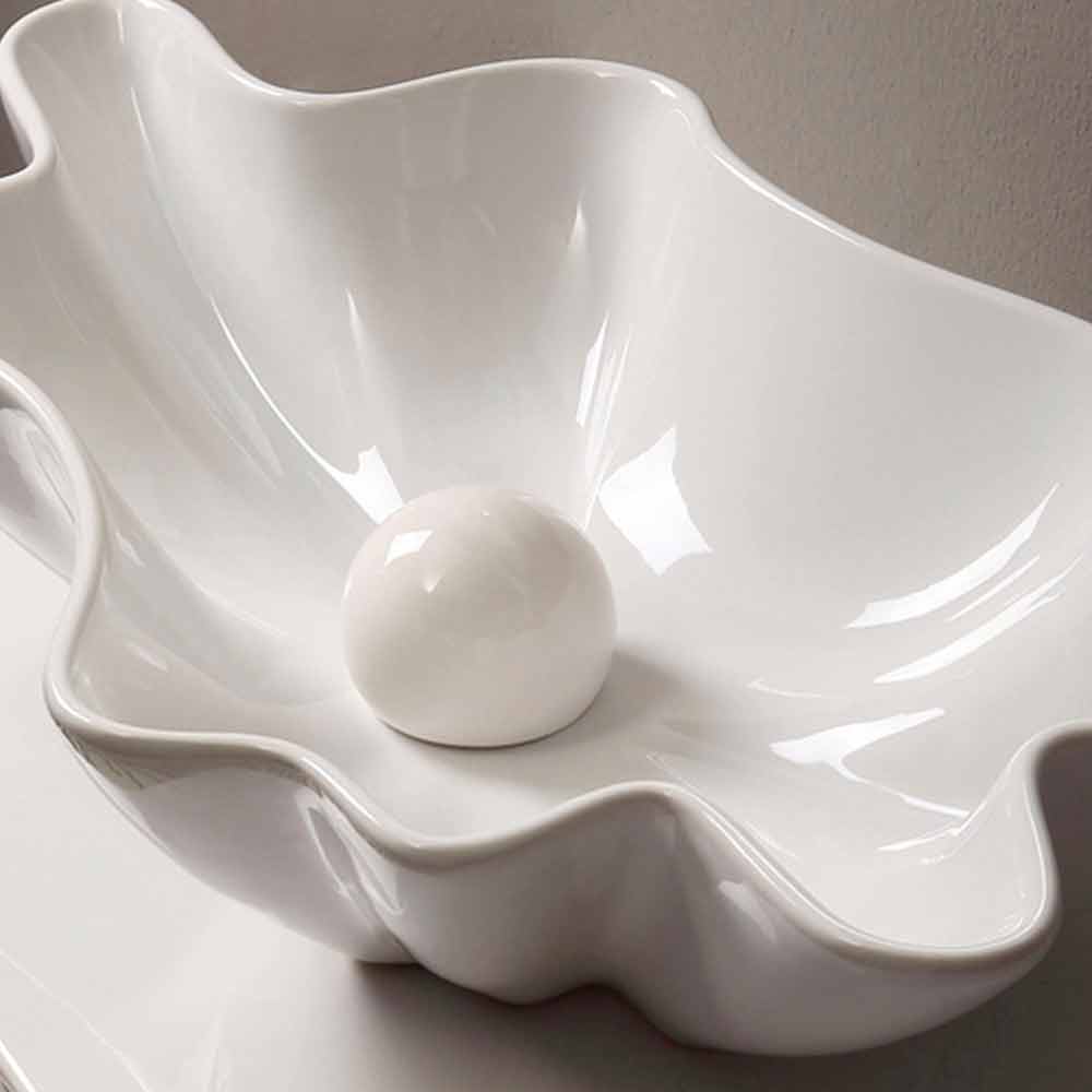 Waschbecken, das durch seinen perlenförmigen Abfluss an das Meer erinnert und so die Illusion erweckt, es sei eine Auster.