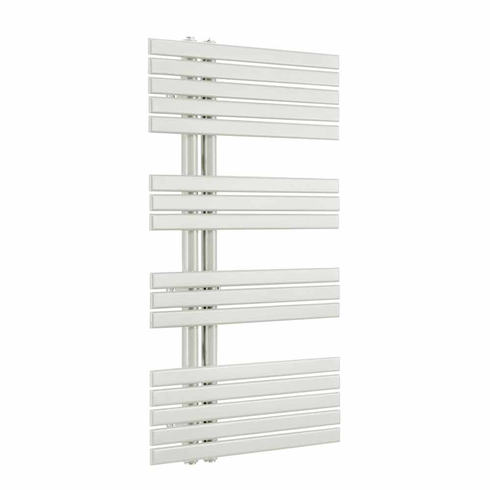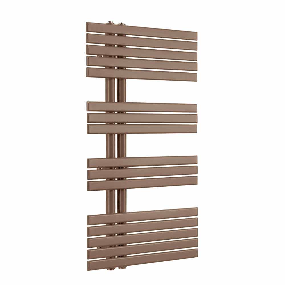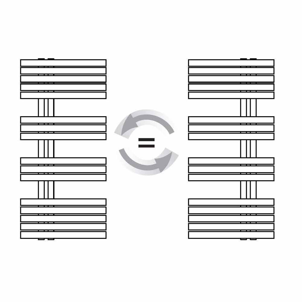Handtuchwärmer verfügt über ein Design mit vertikalen Rohren mit einem Durchmesser von 35 mm und horizontalen flachen Lamellen mit einem Durchmesser von 35 mm. Seine moderne und besondere Form macht es