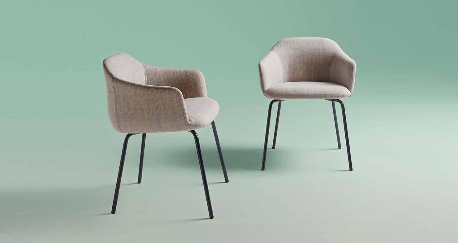 durchgehenden und geschwungenen Linien der Rückenlehne und des Sitzes, die beide mit Polyurethanschaum gepolstert sind und auf einem dünnen Eisen ruhen, den Komfort und die Weichheit, als würde er auf einer Knospe stehen Struktur.