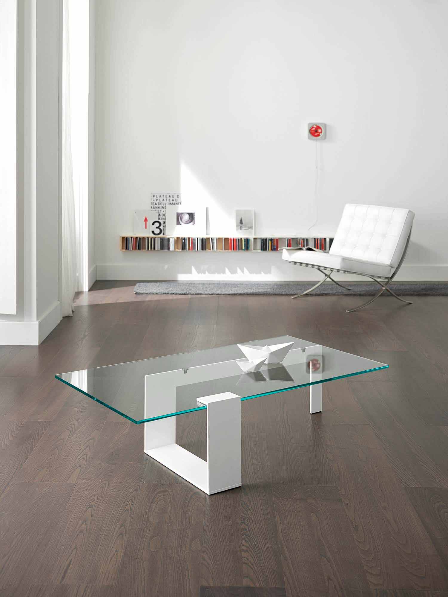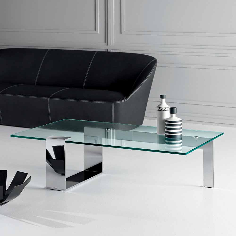 Niedriger Couchtisch im modernen Design mit extra klarer Glasplatte und Metallbasis, hergestellt in Italien.
