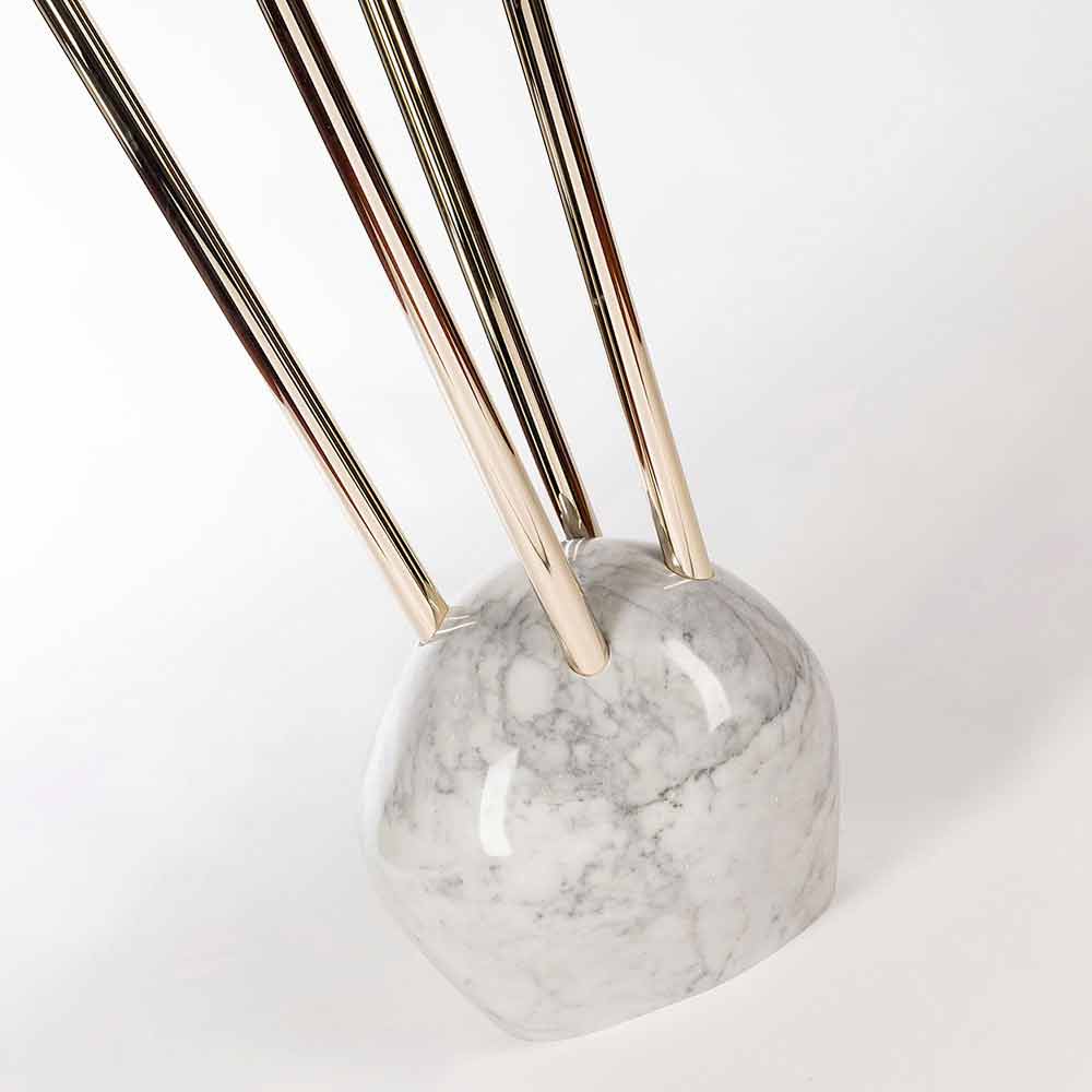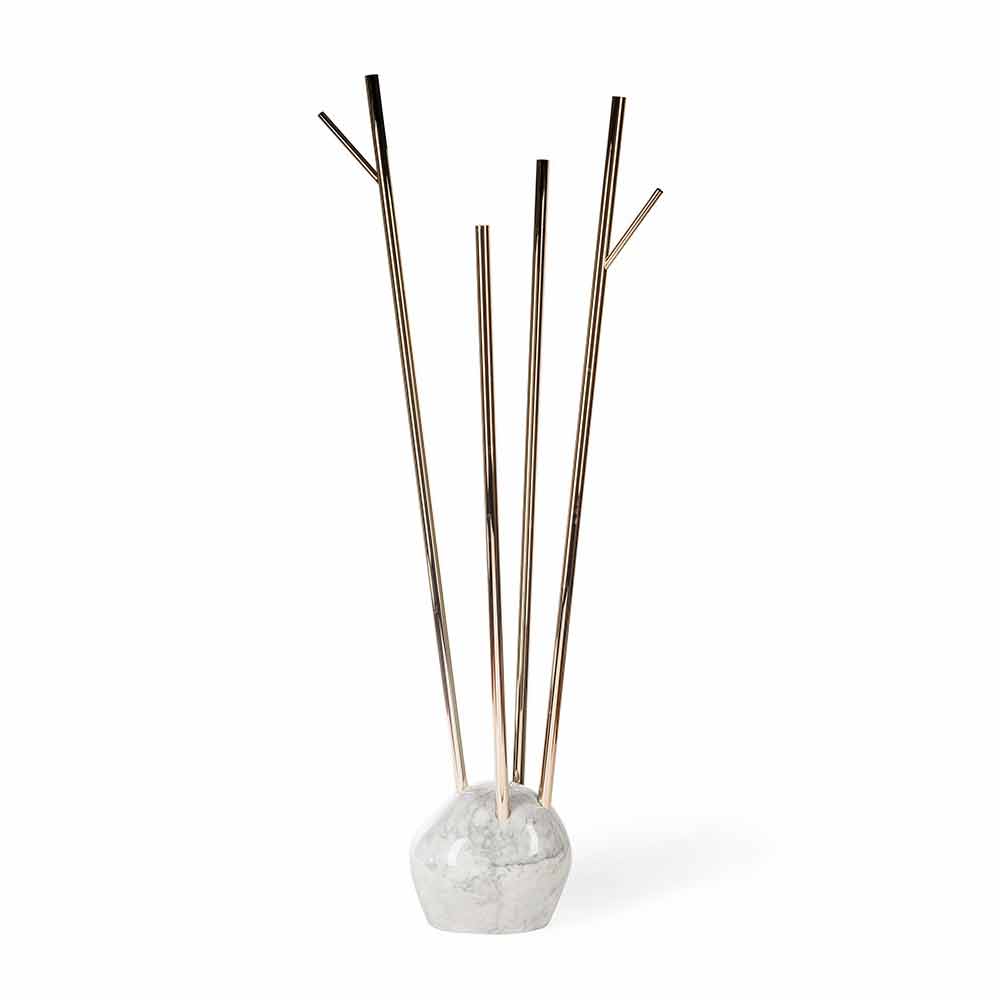 Kleiderbügel mit Sockel aus weißem Carrara-Marmor und verzinkten Metallstäben in 24 kt glänzendem Gold.