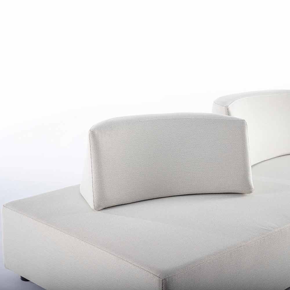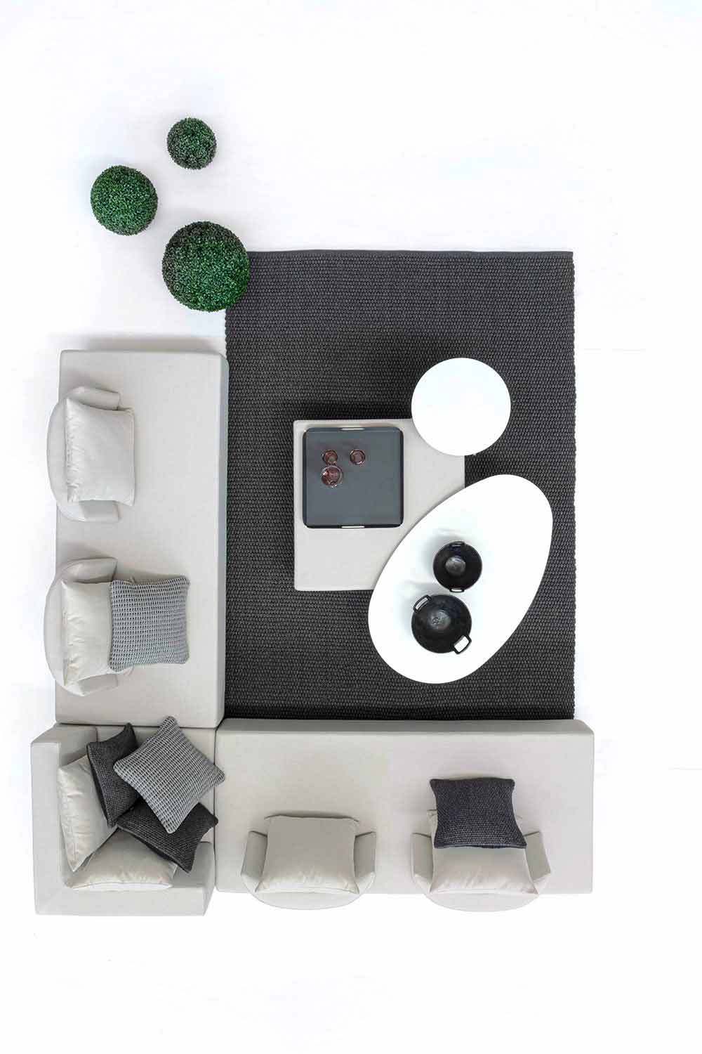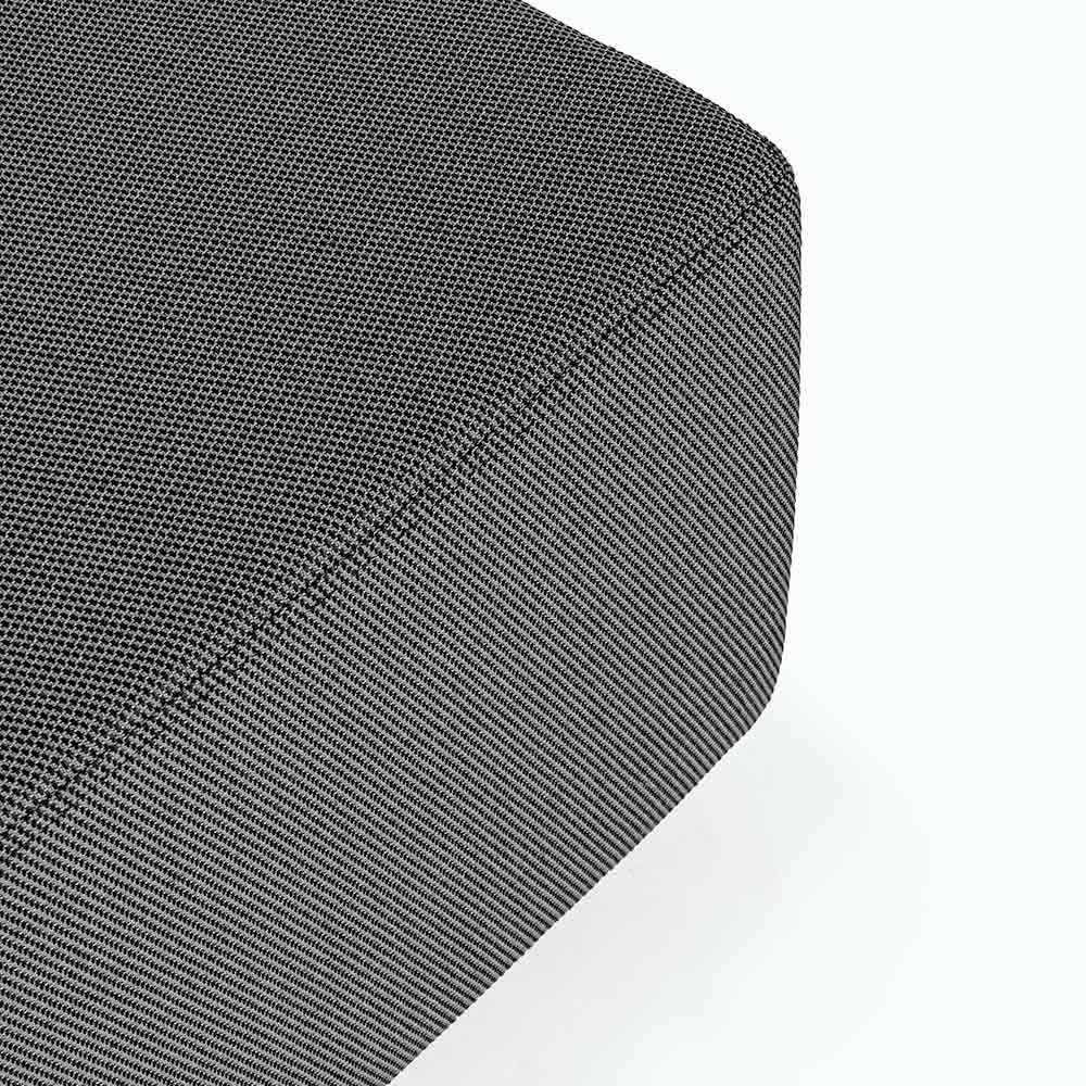 Sitze, Rückenlehnen und Kissen mit abnehmbarem Bezug aus Olefingewebe für den Außenbereich (100% Polypropylen, 285 g / m2), wasserabweisend und UV-beständig (Klasse 7), innen wasserdicht mit Stoffbeschichtung (Polyurethan). Polstersitz aus Polyurethanschaum (38 kg / m3), Rückenlehne (20 kg / m3).