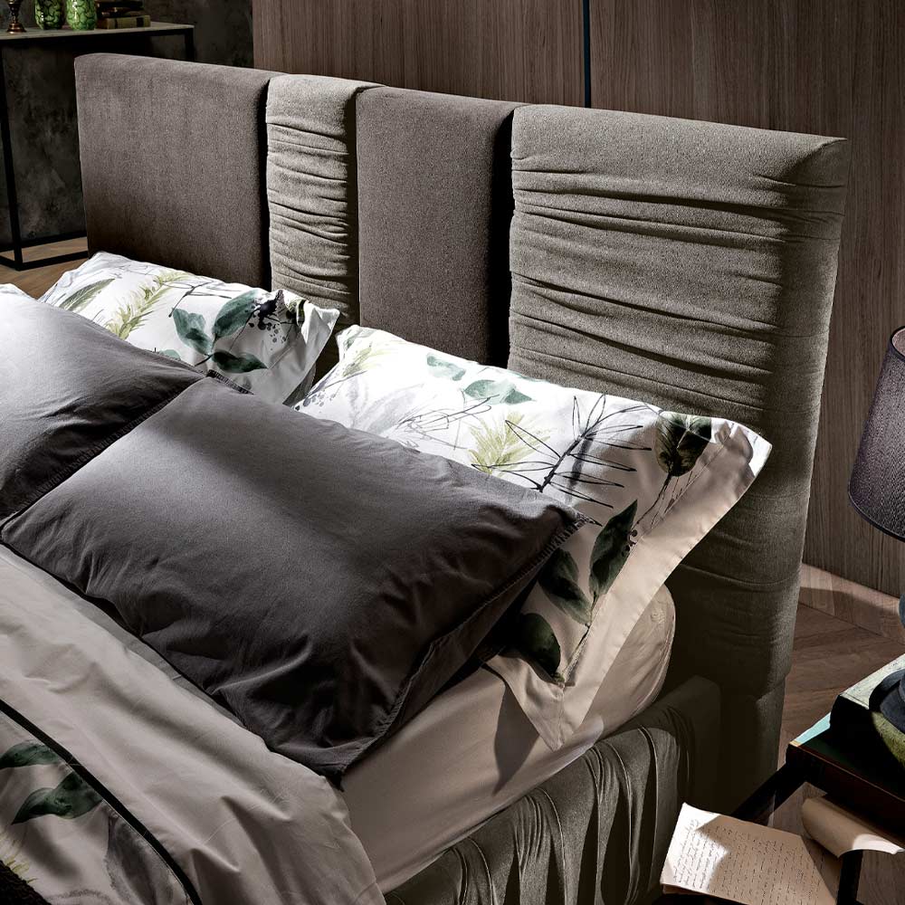 In den Versionen Vulkan und Elefant zeigt die moderne Designergänzung die Schönheit des Stoffes mit Falten, der auch auf den Bettrahmen aufgebracht wird.