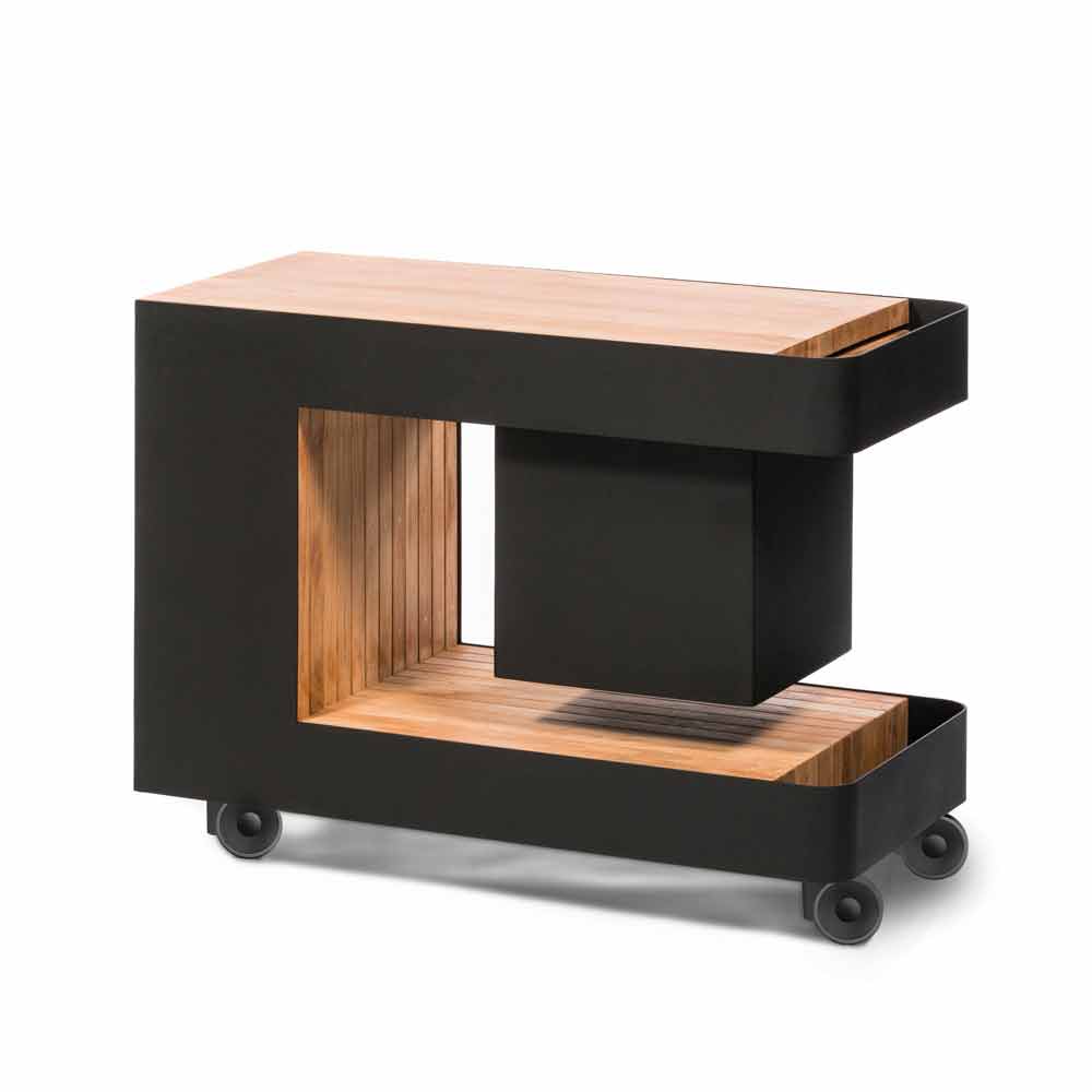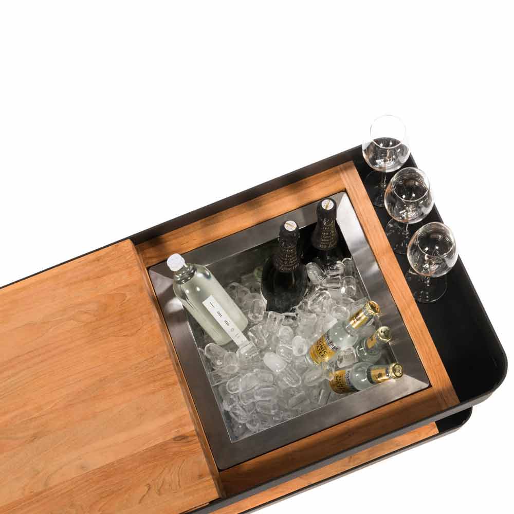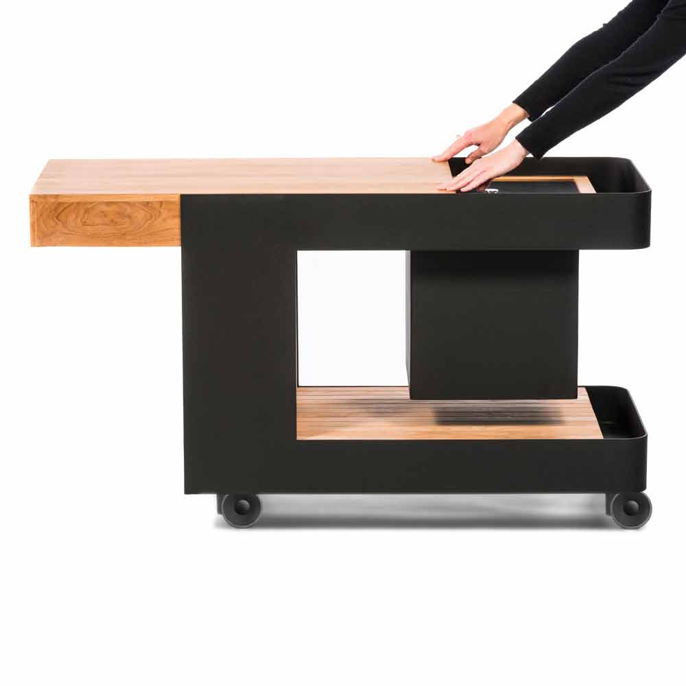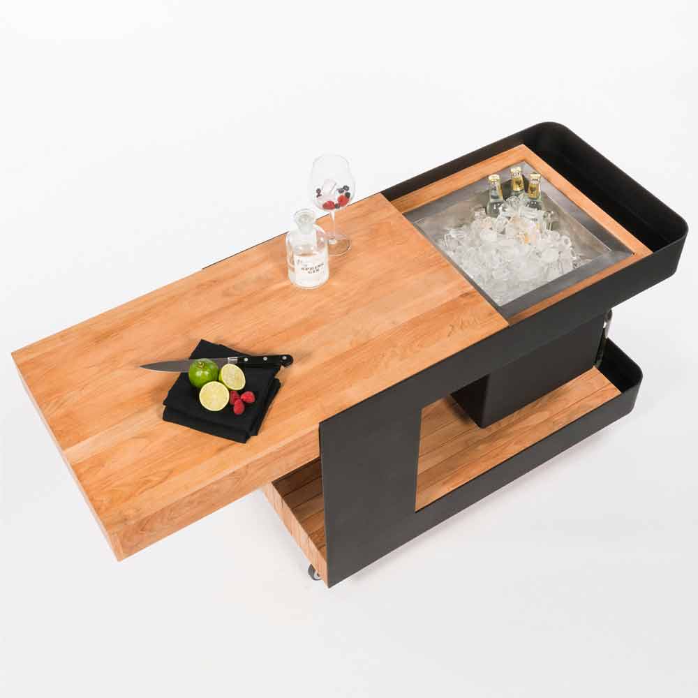 Mobile Bar auf Rädern für den Außenbereich mit Tisch, modernes Design, aus Holz und Stahl, hohe Qualität.