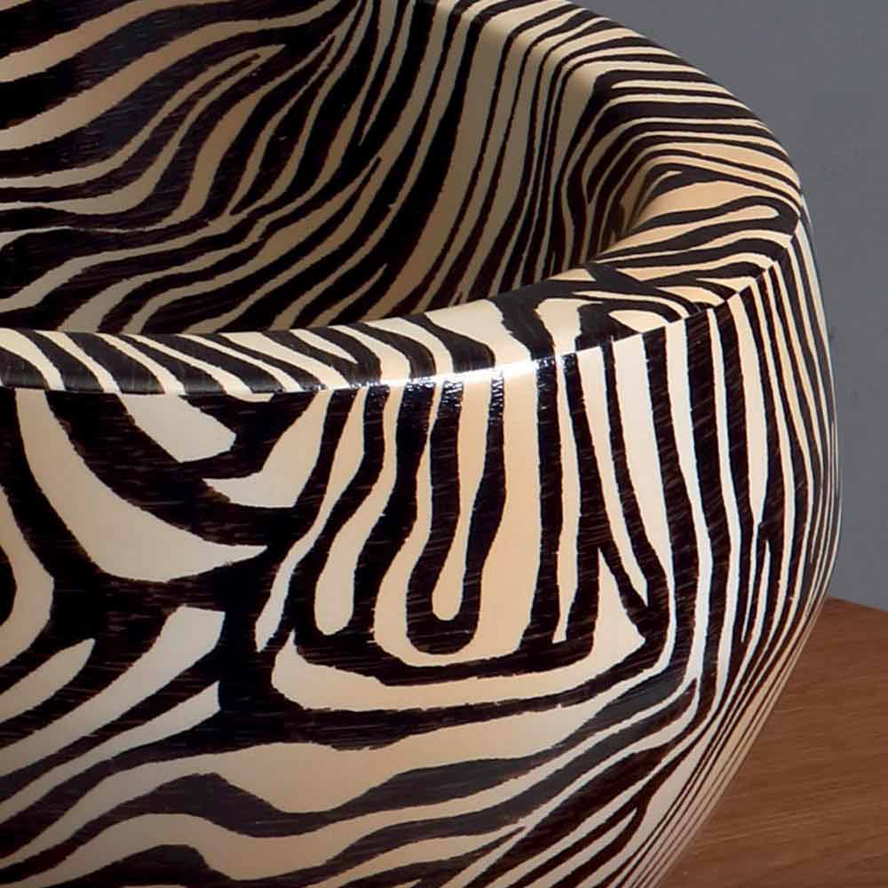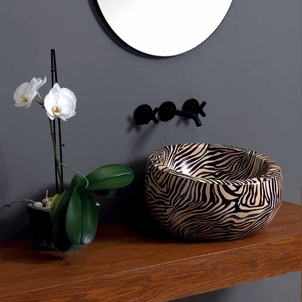Elisa ist ein Aufsatzwaschbecken aus Keramik mit orangefarbenem Zebrafinish und hellen und entschiedenen Linien.
