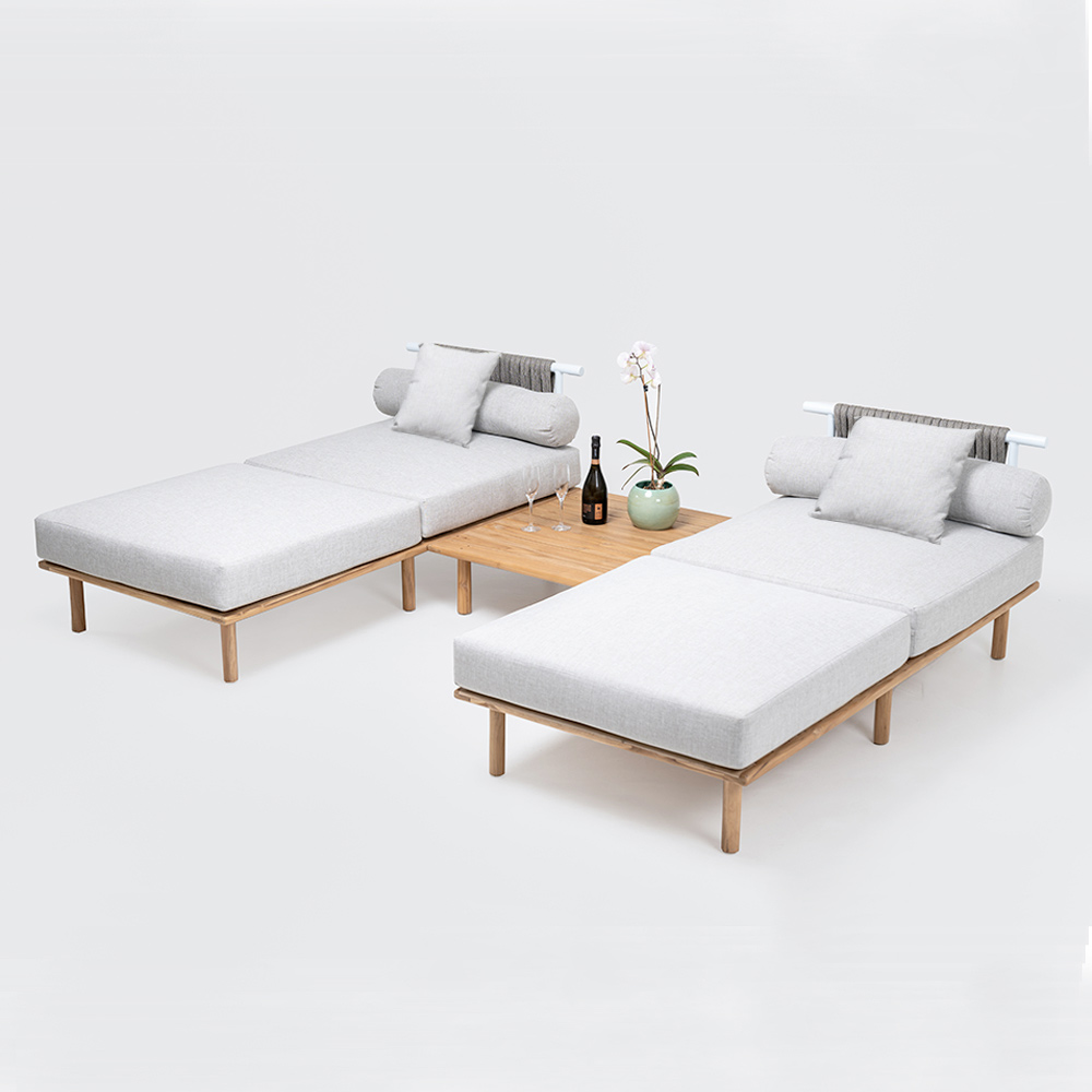 Dieses modulare Gartenset ist der Inbegriff von Vielseitigkeit und Stil . Entworfen, um sich elegant und funktional in jeden Außenbereich einzufügen, zeichnet es sich durch die Kombination von natürlichen Materialien und zeitgenössischem Design aus. Teakholz , bekannt für seine Stärke und Langlebigkeit, bildet die solide Basis, auf der weiche und einladende hellgraue Kissen ruhen.