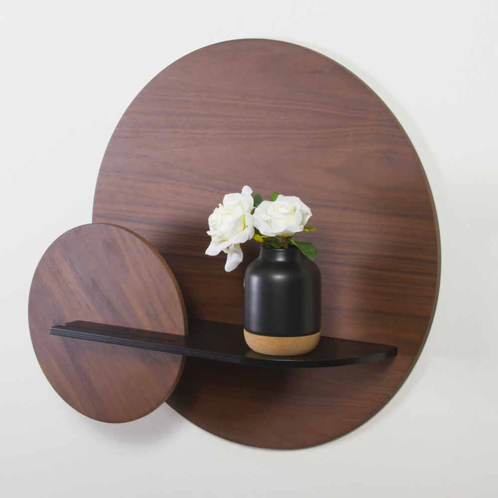 Dieses Regal besteht aus 3 Sperrholzplatten , von denen eine in schwarz gebeizter Esche mit einem Metallträger an der Wand befestigt ist, der als echte Auflagefläche dient, und zwei weiteren vertikal montierten runden Platten in Walnussoptik , die positioniert werden können in 8 verschiedenen Konfigurationen, die es ermöglichen, ein an den Geschmack und die Bedürfnisse anpassbares Produkt zu erhalten. Um die Funktionalität dieses wundervollen Artikel weiter zu erhöhen, gibt es ein praktisches Kabelloch hinter der kleineren vertikale Platte, ideal positionierte , für jede Art von Kabeln oder Ladegerät versteckt.