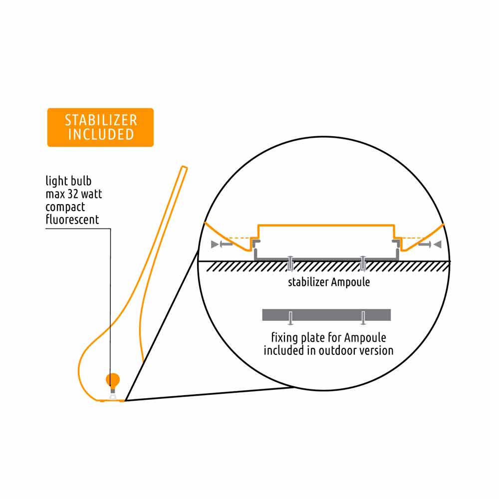 Sein majestätisches Design ist kein Riese mit Füßen aus Ton: Die Ampulle XL ist dank der Befestigungshalterung und des Vorschaltgeräts fest im Boden verankert, was ihr weitere Stabilität verleiht.