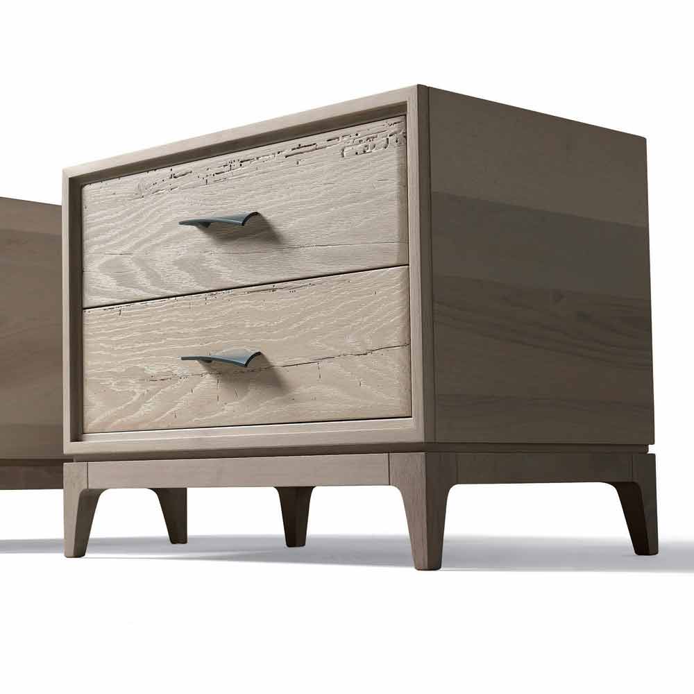 Für den Schlafbereich der Nachttisch mit einer strengen Form, mit eleganten Griffen mit einer leicht geneigten Form an den Eichentüren.