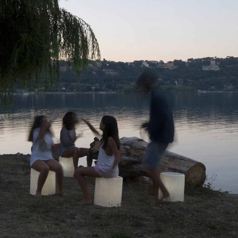 Hergestellt von In-es.artdesign für die Kollektion Out in Laprene und Nebulite: ein innovatives Material aus Harz und Fasern, dessen Adern der Lampe einen besonderen Mond- und Marmoreffekt verleihen.
