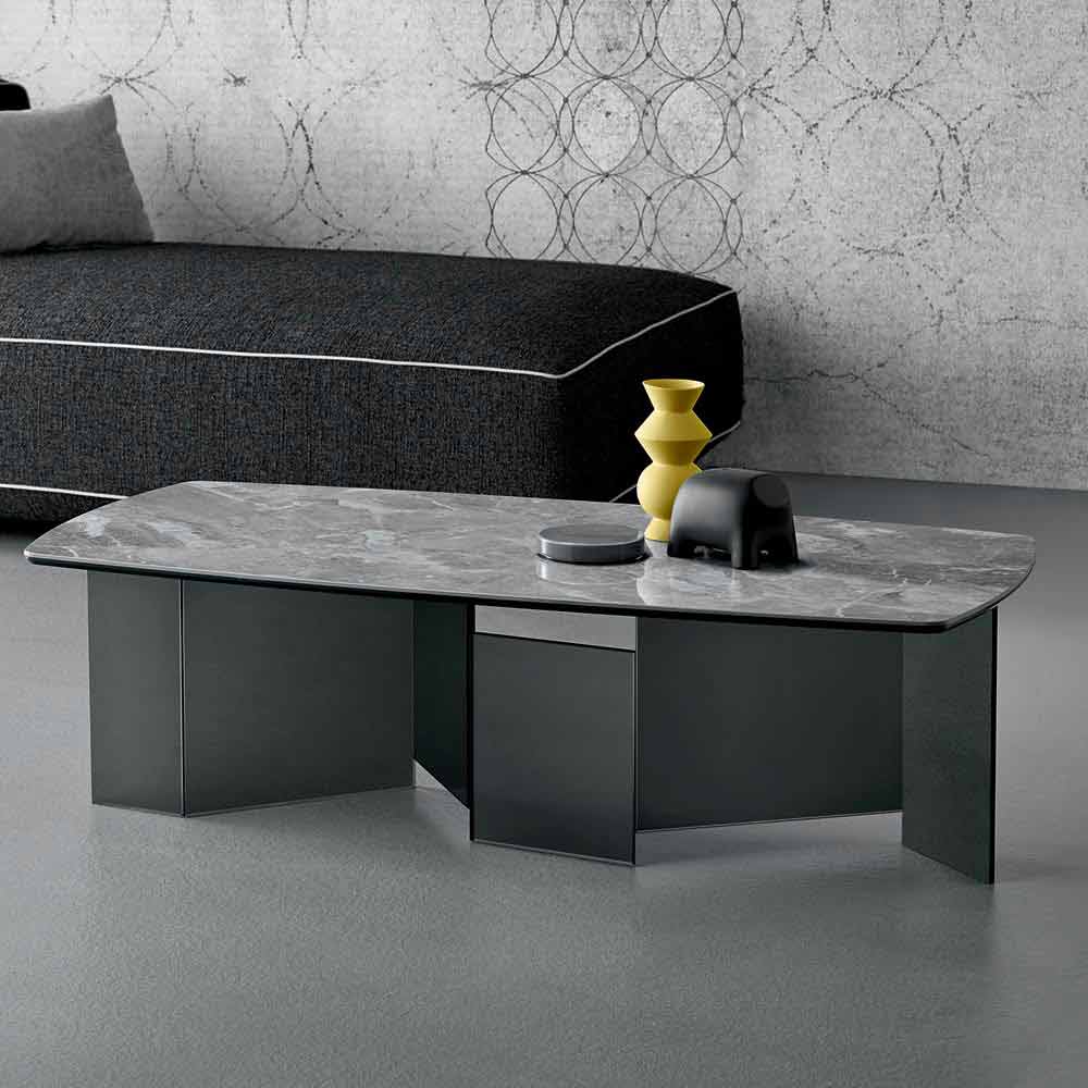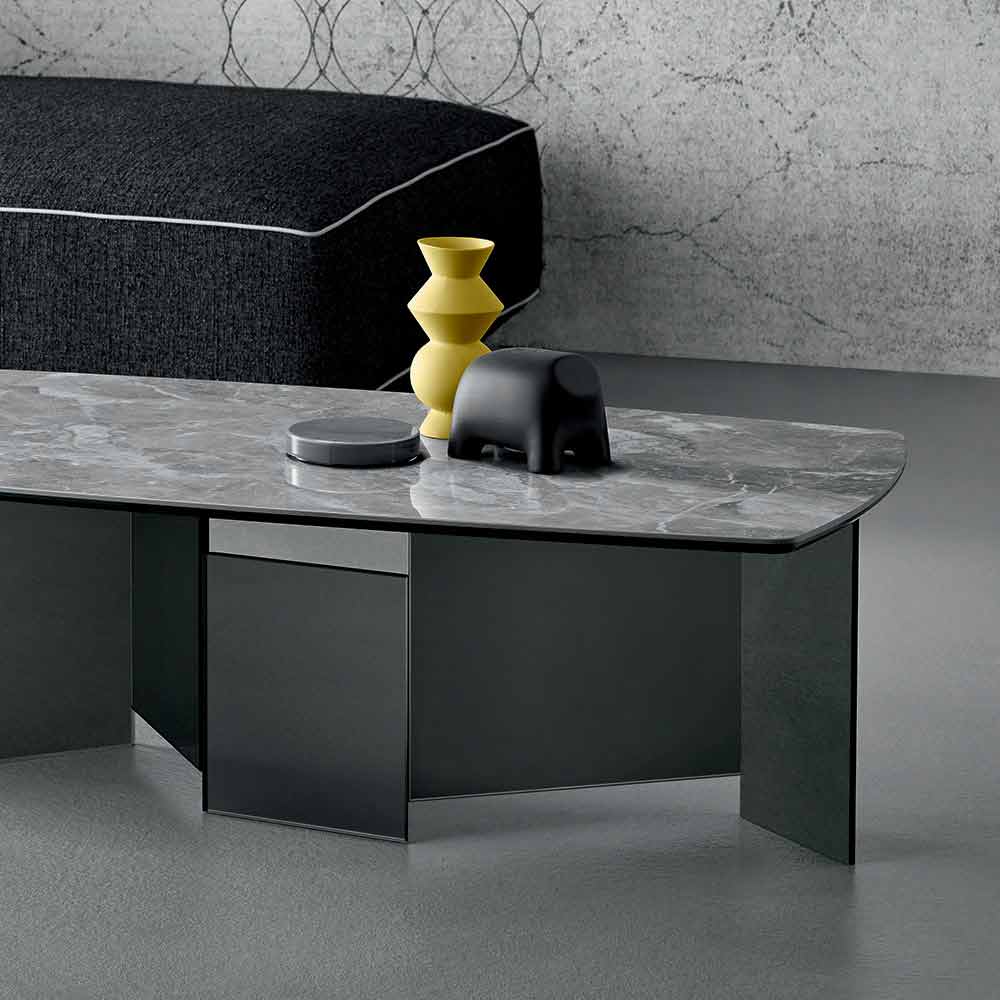 Niedriger Tisch mit Keramikplatte und Rauchglasbeinen in 3 Größen made in Italy.