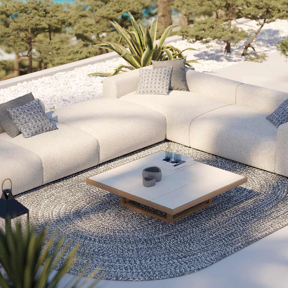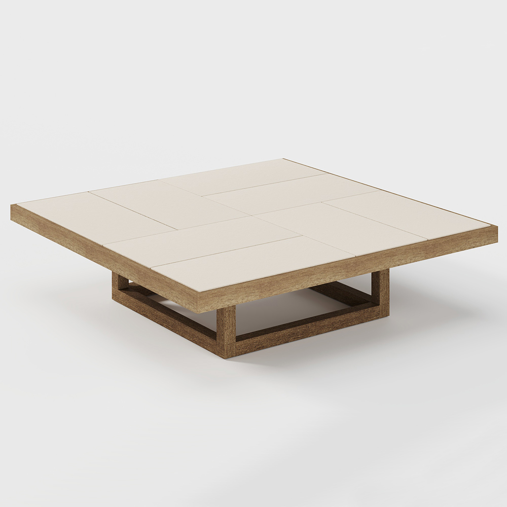 Niedriger Garten-Couchtisch aus Iroko-Holz und Platte aus Steinzeugplatten Made in Italy