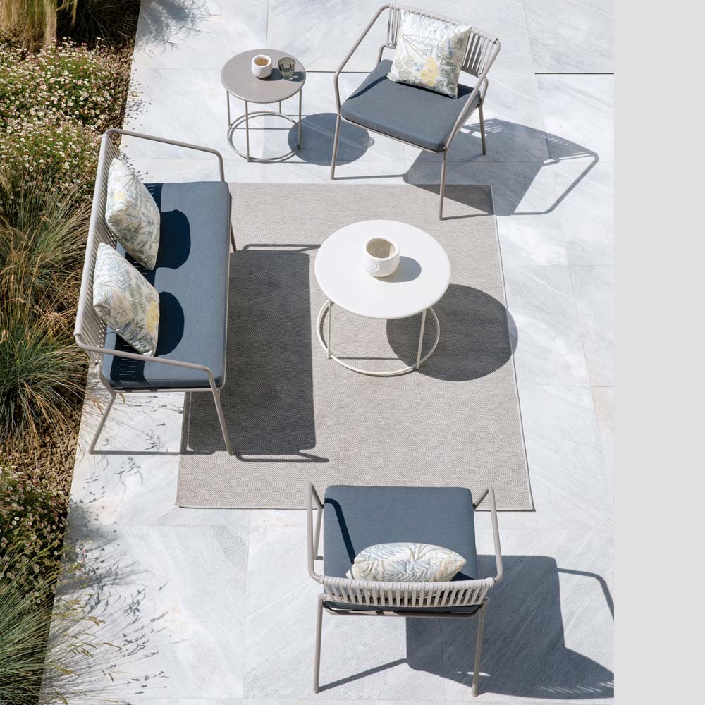 wasserdichte und UV-beständige Polsterstoff ergänzt die Struktur perfekt und bietet einen weichen und einladenden Sitz, ohne auf Stil zu verzichten. Ob Sie Ihren Morgenkaffee genießen oder den Sonnenuntergang betrachten, dieser Sessel ist der ideale Begleiter für jeden Moment der Ruhe und verbindet mühelos die Schönheit