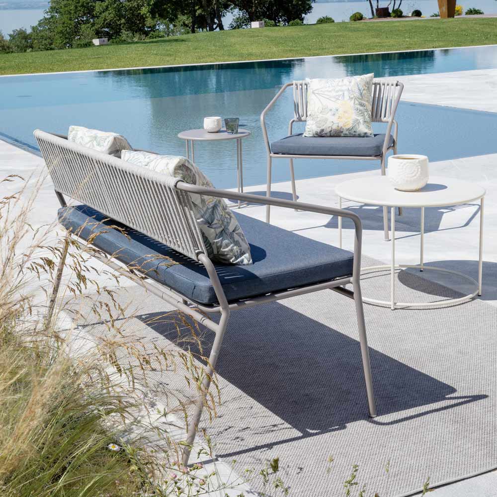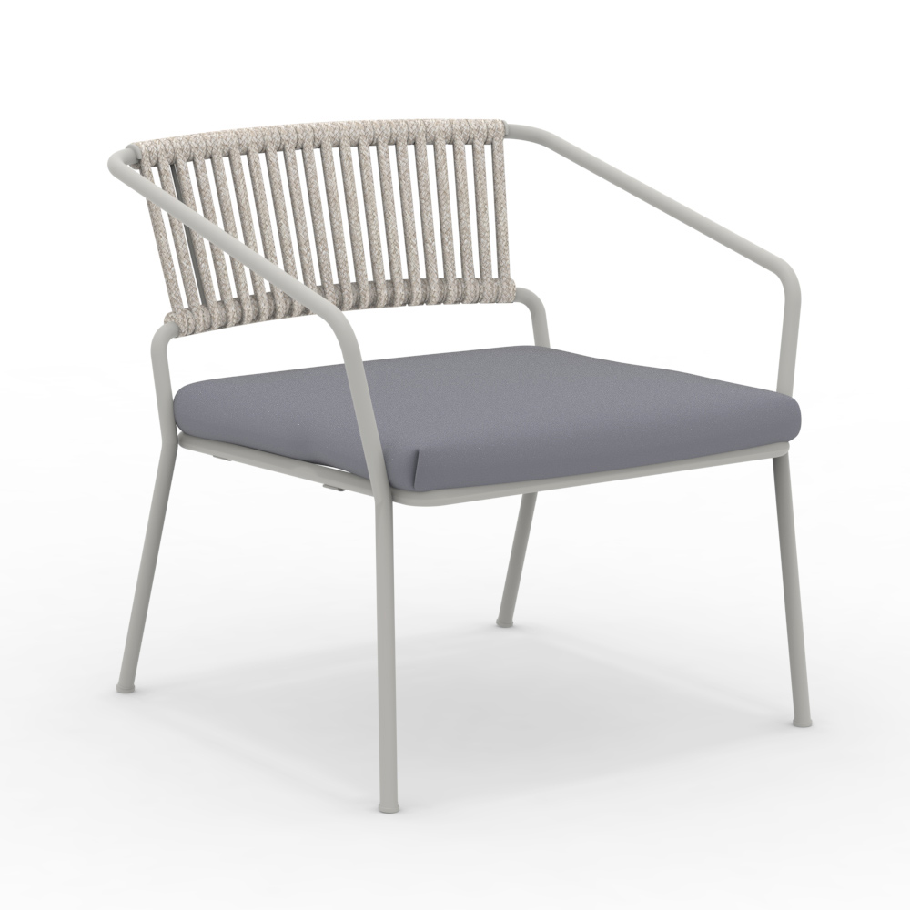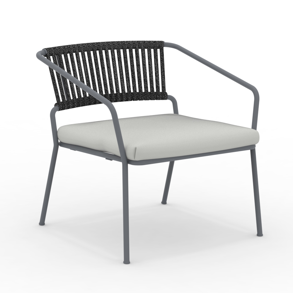 Niedriger Gartensessel mit pulverbeschichtetem verzinktem Eisenrahmen und Sitz aus Seil und Stoff. Hergestellt in Italien