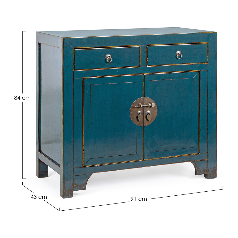 Niedriger Schrank aus blauem Ulmenholz mit 2 Türen und 2 Schubladen, Design im Vintage-Stil.