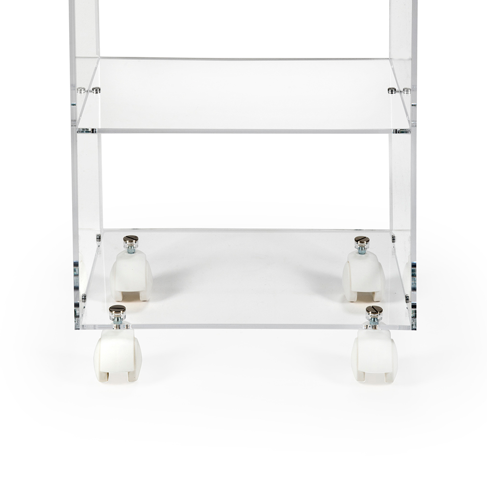Vielseitiger Wagen, der die Essenz der Zweckmäßigkeit mit einem Hauch von transparentem Charme verkörpert. Hier handelt es sich um ein Stück, das nicht nur ein Einrichtungsaccessoire ist, sondern eine wahre Hommage an moderne Funktionalität.