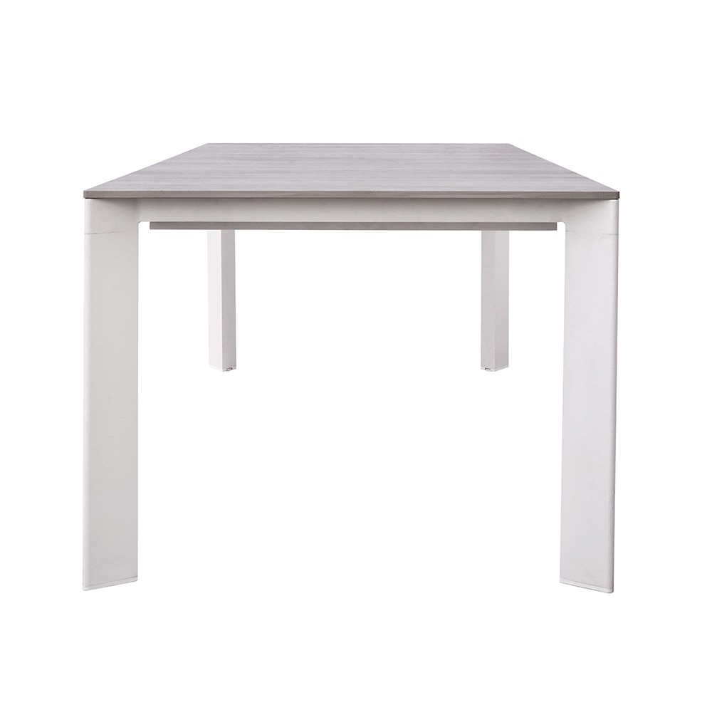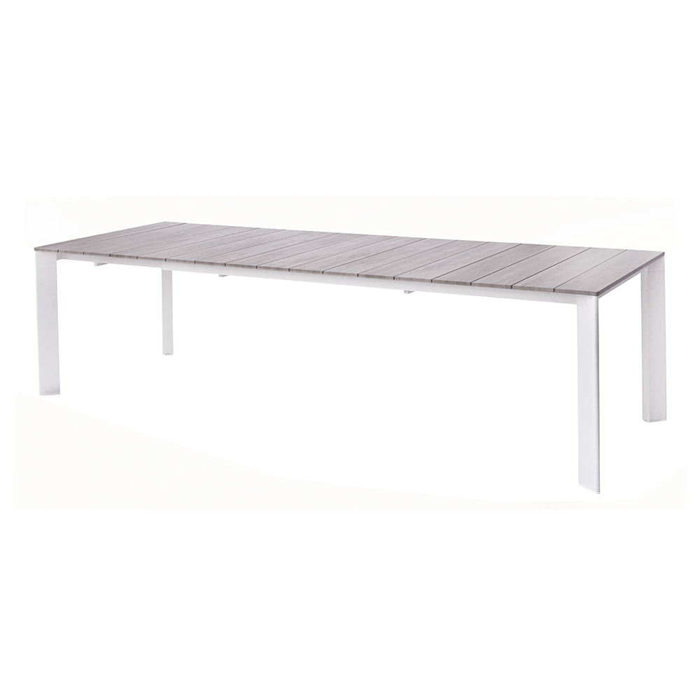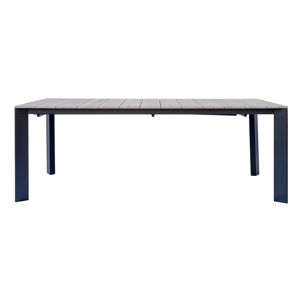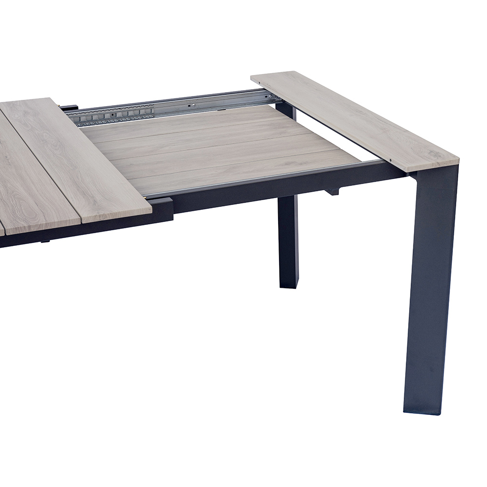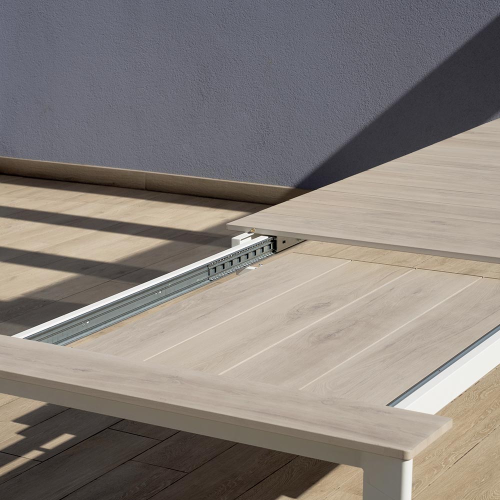Die Tischplatte aus Aluminium in Holzoptik vereint die ästhetische Wärme von Naturholz mit der Robustheit von Aluminium und bietet so eine elegante, langlebige und pflegeleichte Oberfläche. Dank des Ausziehsystems mit verschiebbaren Aluminiumbeinen lässt sich der Tisch mühelos und stufenlos verlängern, ohne dabei an Stabilität und einem harmonischen Erscheinungsbild einzubüßen.