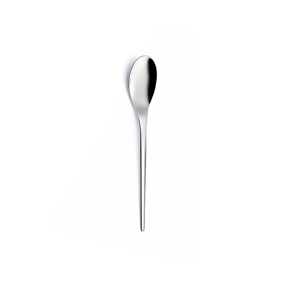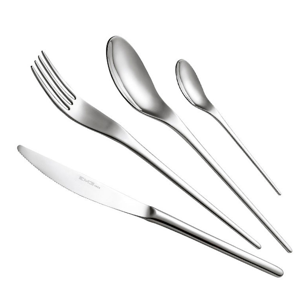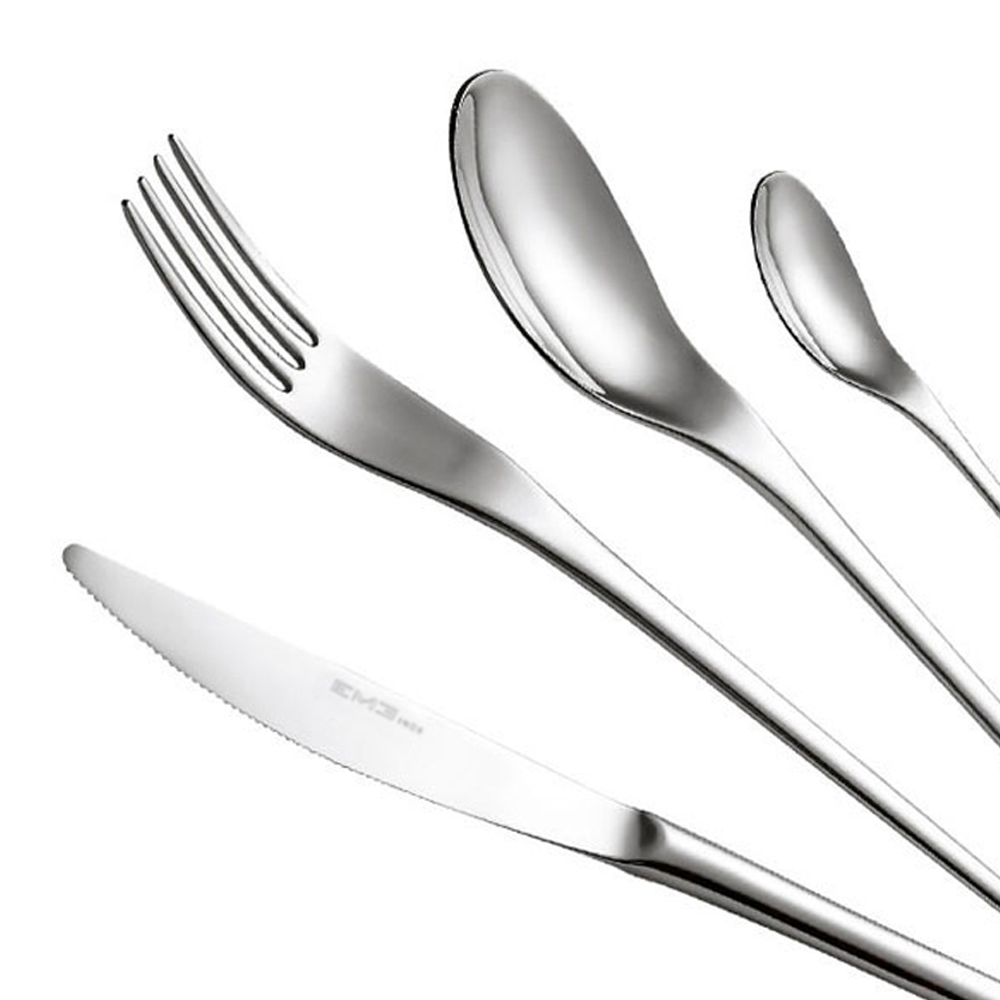 Die Kollektion zeichnet sich durch ihre minimalen und länglichen Linien aus, die von orientalischen Formen inspiriert sind. Tatsächlich erinnern die dünnen Griffe an japanische Essstäbchen mit gut abgerundeten Enden. Auf diese Weise ist die Handhabung sehr angenehm. Gabeln und Löffel öffnen sich allmählich ohne Kanten , mit weichen und modernen Formen, während das schlanke und leichte Messer ein dynamisches Erscheinungsbild beibehält.