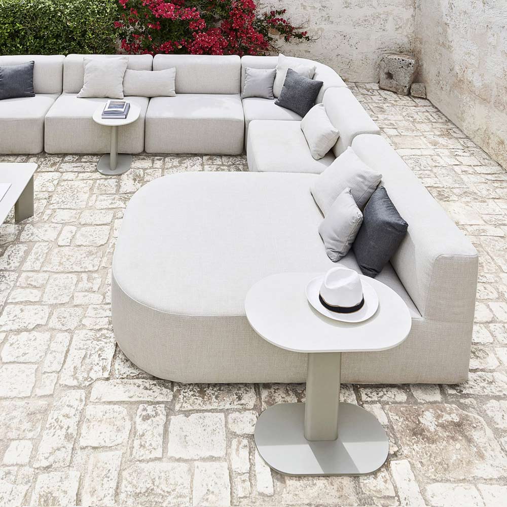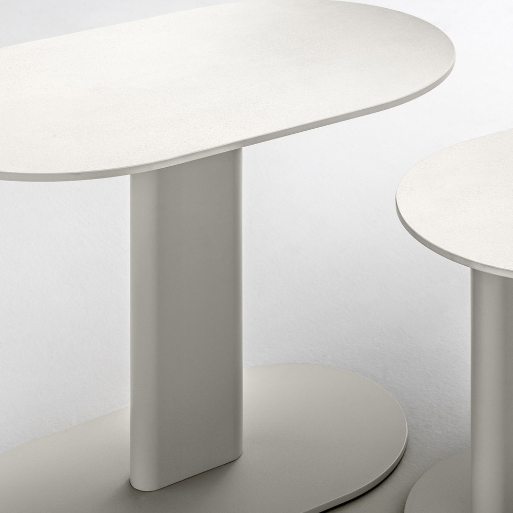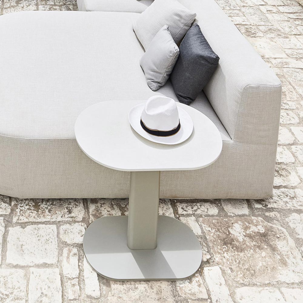 Garten-Couchtisch bestehend aus einer Aluminiumstruktur, die auf einem Stahlgestell mit einem seidengrauen Schutzzyklus und einer kalkweißen HPL-Platte ruht, hergestellt in Italien. Dank seines geradlinigen, sauberen und funktionalen Designs eignet sich dieser Couchtisch perfekt zur Dekoration von Außenbereichen wie Terrassen, Schwimmbädern und Gärten, findet aber auch seinen Platz in den verschiedenen Wohnbereichen im Innenbereich.