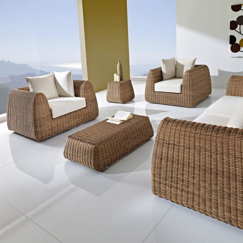 Das raffinierte Design, die sehr hohe Qualität der Materialien und seine geschwungenen Formen machen ihn perfekt für die Innen- und Außeneinrichtung. Dank der Verwendung spezieller hochwertiger Materialien ist dieser Tisch für den Außenbereich dank der Zertifizierung der gewebten Fasern unempfindlich gegenüber schlechtem Wetter und Temperaturschwankungen.