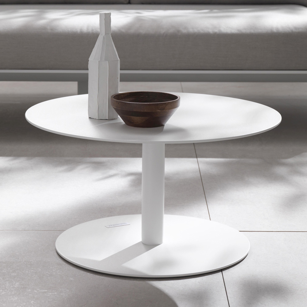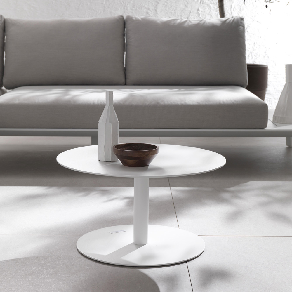 Beistelltisch für den Garten , bestehend aus einer Platte und einer Struktur aus Aluminium , das mit weißen Epoxidpulvern lackiert ist . Dieser Couchtisch, der sich durch ein weiches, lineares und schlichtes Design auszeichnet, eignet sich perfekt für die Einrichtung von Außenbereichen wie Terrassen, Schwimmbädern und Gärten und findet gleichzeitig seinen Platz in den verschiedenen Wohnbereichen im Innenbereich als funktionaler Stützpunkt.