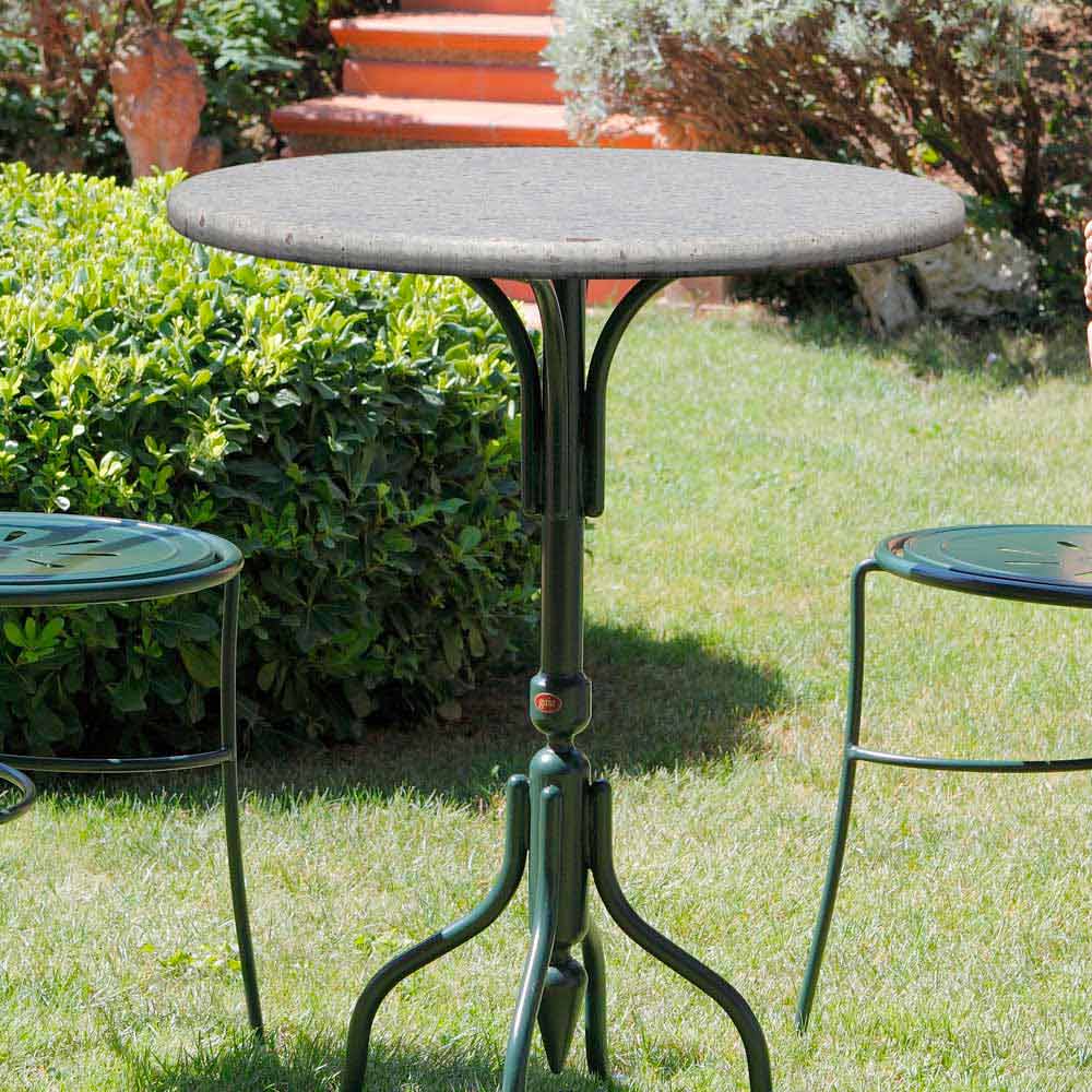 In Italien handgefertigter Outdoor-Couchtisch mit runder Steinplatte und grün lackiertem Eisensockel. Ein Einrichtungsaccessoire für Außenbereiche, das sich durch klassische Merkmale auszeichnet, die an ein Design der Vergangenheit erinnern, das durch das besondere Finish, das die gesamte Basis bedeckt, charakteristische Elemente des Couchtisches, bereichert und einzigartig gemacht wird. Die Steinplatte hingegen verleiht eine exklusive Note und bietet gleichzeitig eine solide und widerstandsfähige Auflagefläche sowie eine Struktur, die dank der Feuerverzinkung die Rostbeständigkeit des Metalls über Jahrzehnte und eine hervorragende Beständigkeit gegen alle Mittel garantiert. ätzend. Die in Italien hergestellte Handwerkskunst ermöglicht es uns auch, ein qualitativ hochwertiges Produkt anzubieten, das sich durch die Verwendung exklusiver Materialien , Liebe zum Detail und feinen Oberflächen auszeichnet. So entsteht ein funktionelles , langlebiges und qualitativ hochwertiges Produkt.