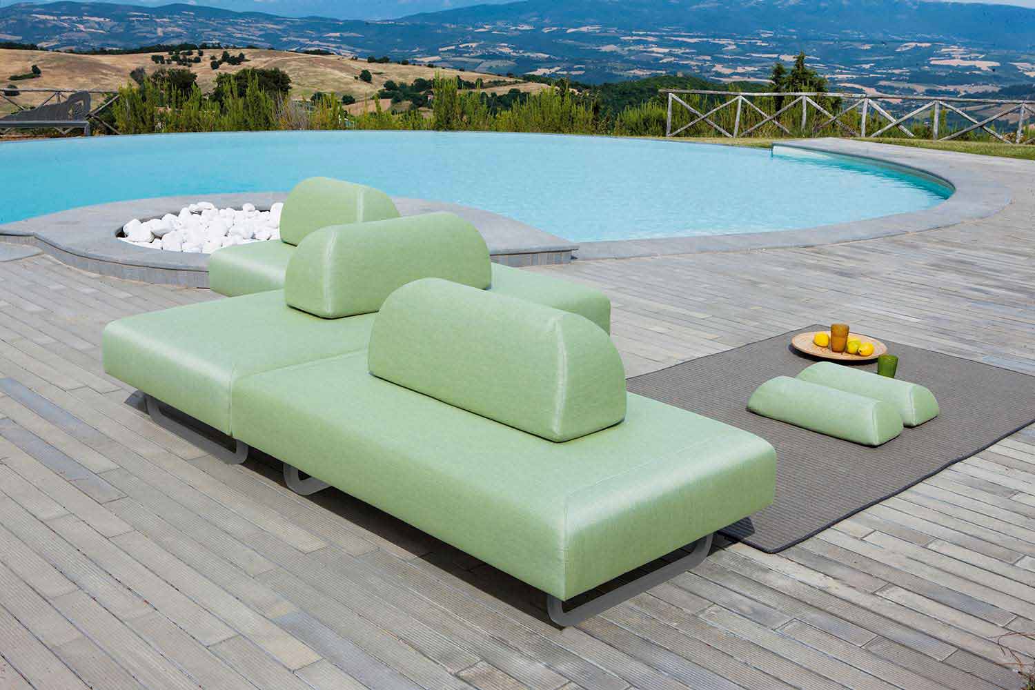 Designer-Chaiselongue für den Außenbereich aus pulverbeschichtetem verzinktem Eisen und 100 % gefärbtem Acrylstoff. Hergestellt in Italien.