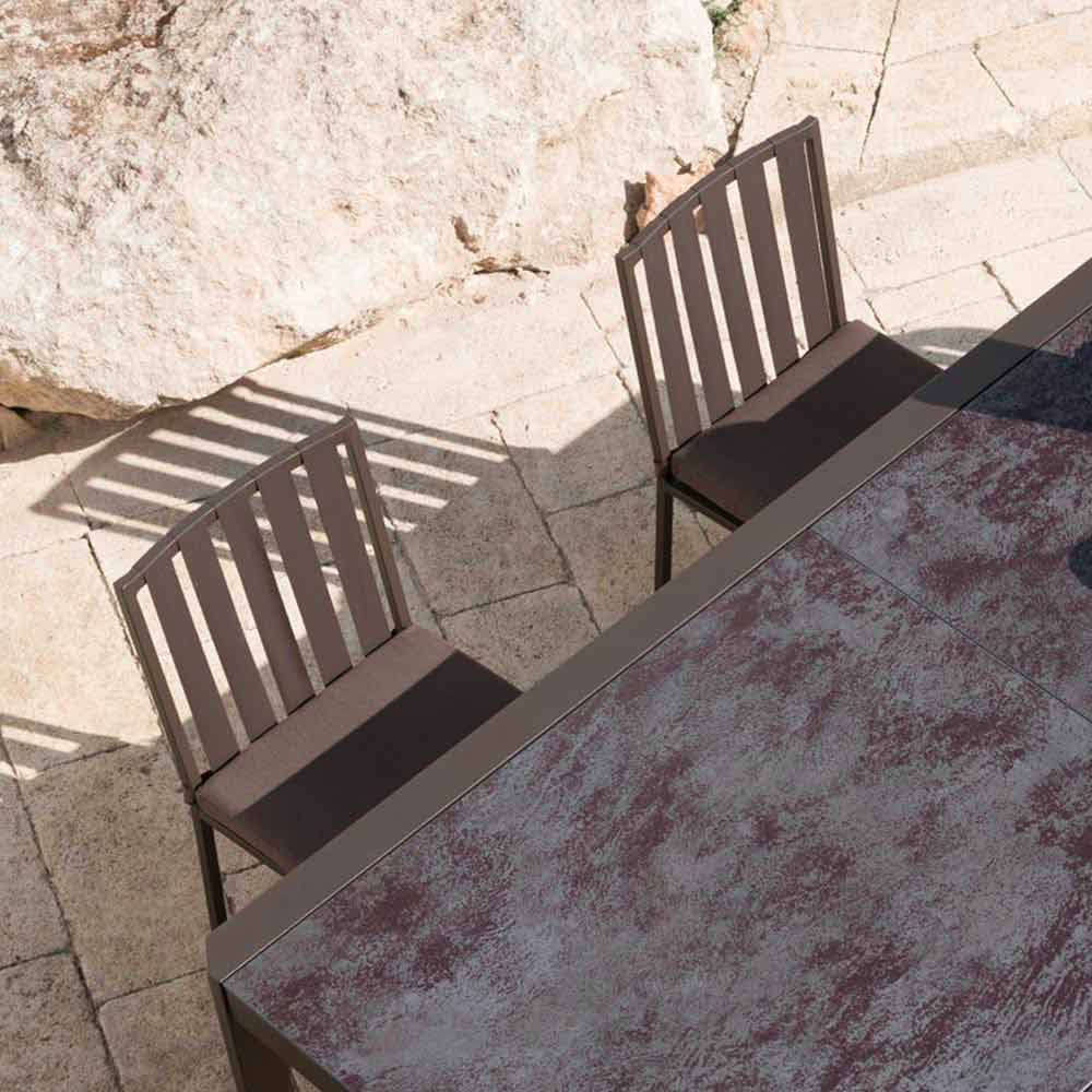Outdoor-Stuhls zeichnet sich durch den Wechsel von leeren und vollen Räumen aus, der ein leichtes und zeitgemäßes Erscheinungsbild schafft.