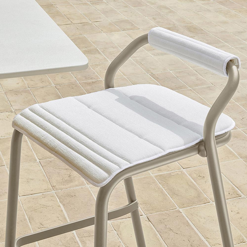 Vollständig in Italien hergestellter Hocker für den Außenbereich mit Struktur aus epoxidpulverbeschichtetem Aluminiumrohr in Seidengrau und Sitz komplett mit weißen Sitz- und Rückenkissen, die mit Dryfeel-Gummi gepolstert sind. Dieses moderne Möbelstück wurde entwickelt, um optimalen Komfort zu bieten und dank seiner eleganten Ästhetik dazu beizutragen, die Außenumgebung zu vervollständigen.