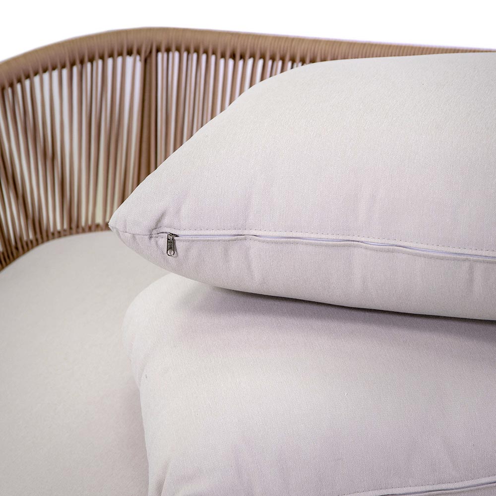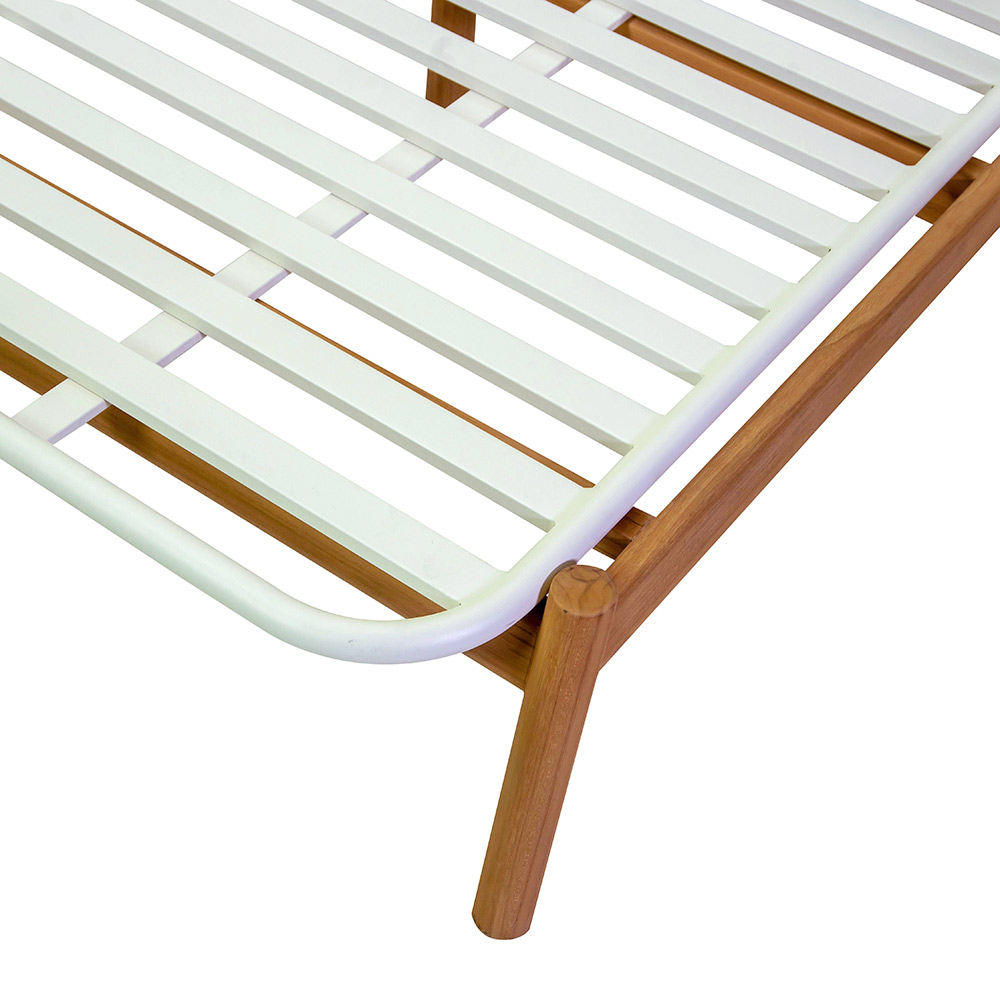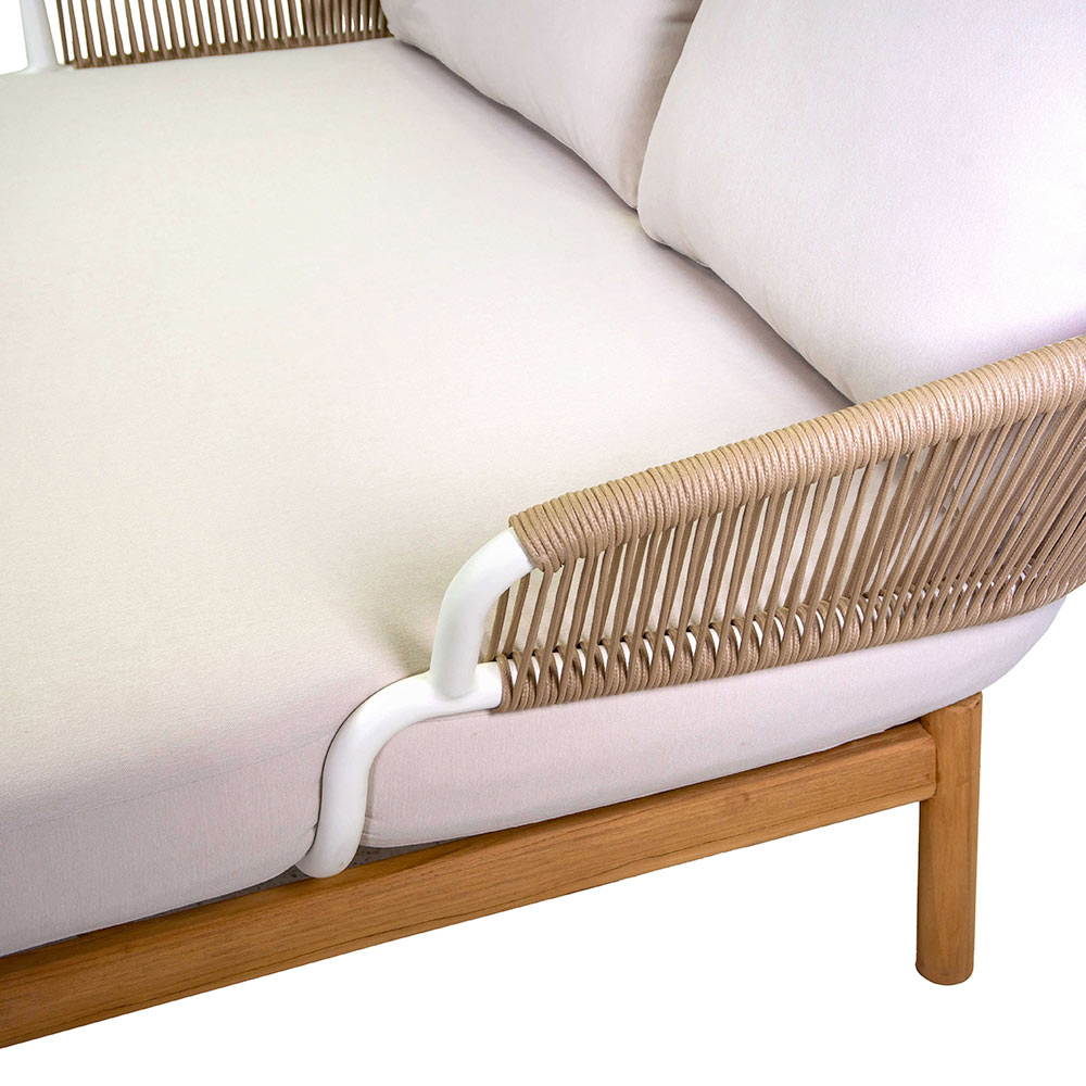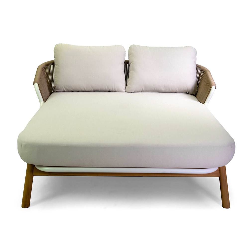 Outdoor Liege mit weiß pulverbeschichtetem Aluminiumrahmen, TEAK Beinen, Durchmesser 38mm und Kissen aus cremefarbenem Olefina Axroma® Stoff.