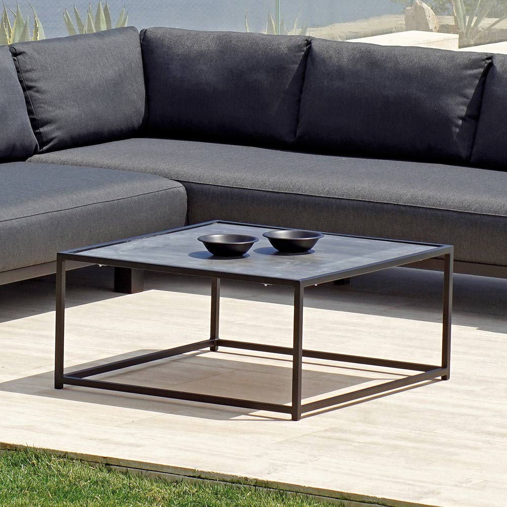 Gartenlounge mit 2 Sofas, Struktur aus schwarzem Aluminium und Couchtisch aus Keramik.