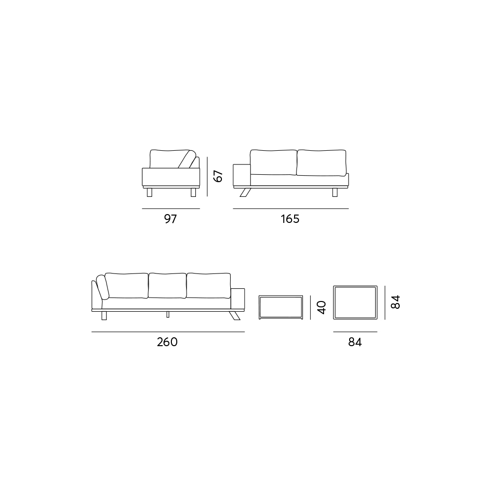 - Dreisitzer-Sofa: B 260 x T 97 x H 67 cm;