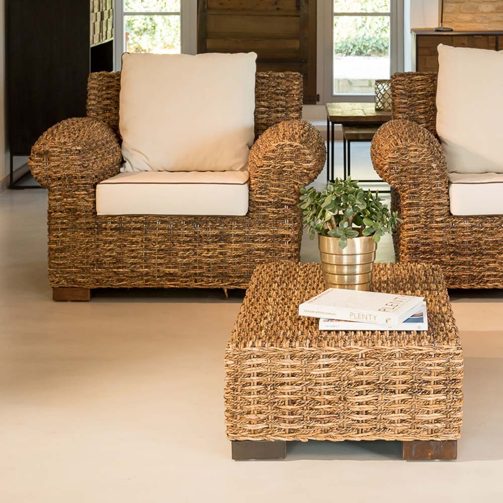 Outdoor Sessel aus handgewebtem natürlichem Abaca mit Kissen im Lieferumfang in der Standard " Ecru " Ausführung und " chocolate " Piping .