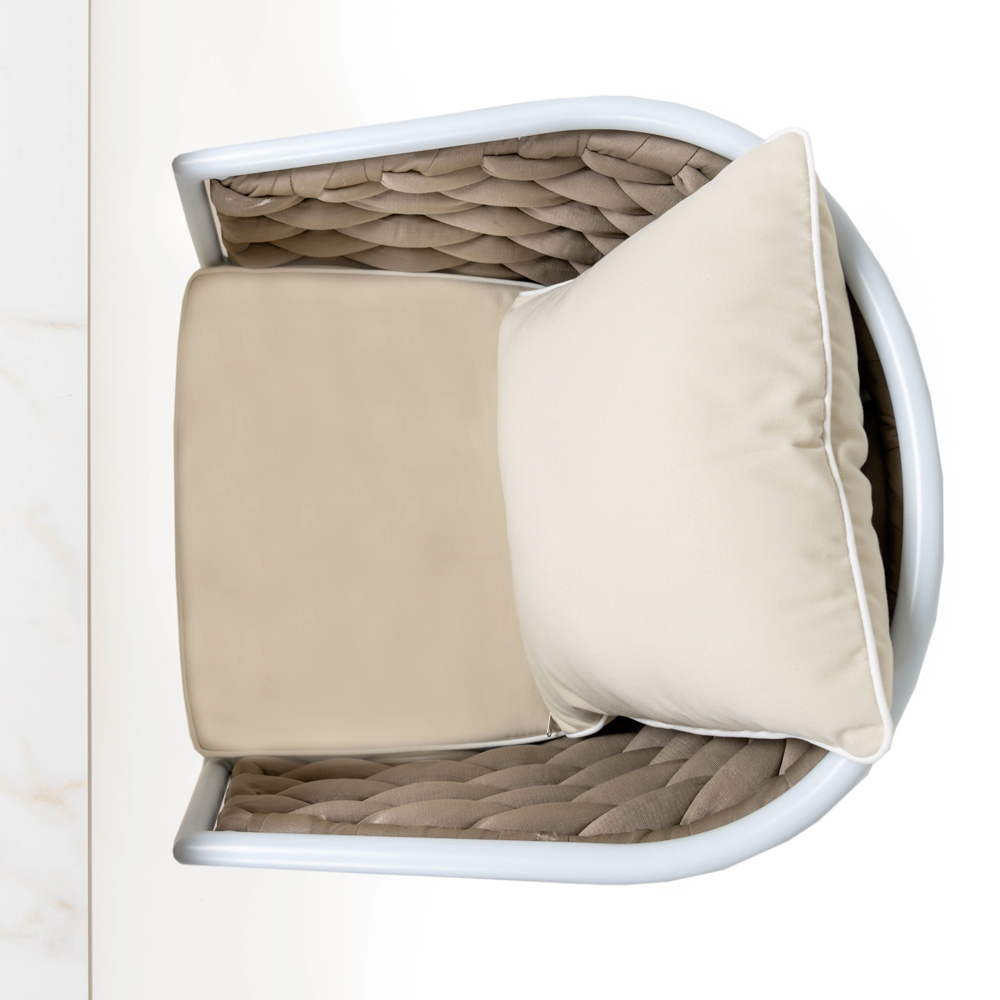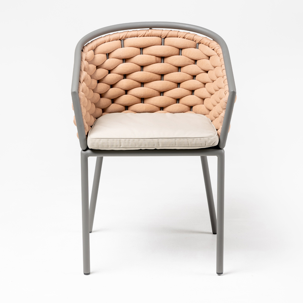 Dieser Gartensessel ist komplett aus gefertigt. Er zeichnet sich durch seine exponiert lackierte Aluminiumstruktur und durch das handgewebte Geflecht aus einem speziellen Olefin-Gewebeschlauch aus, einem spezifischen Material für den Außenbereich, gepolstert mit Polyurethan. Das Sitzkissen ist immer inbegriffen, während das Rückenkissen optional ist und aus steingrauem Outdoor-Stoff besteht.