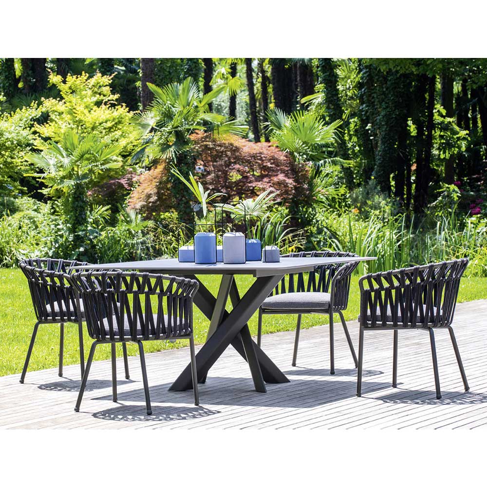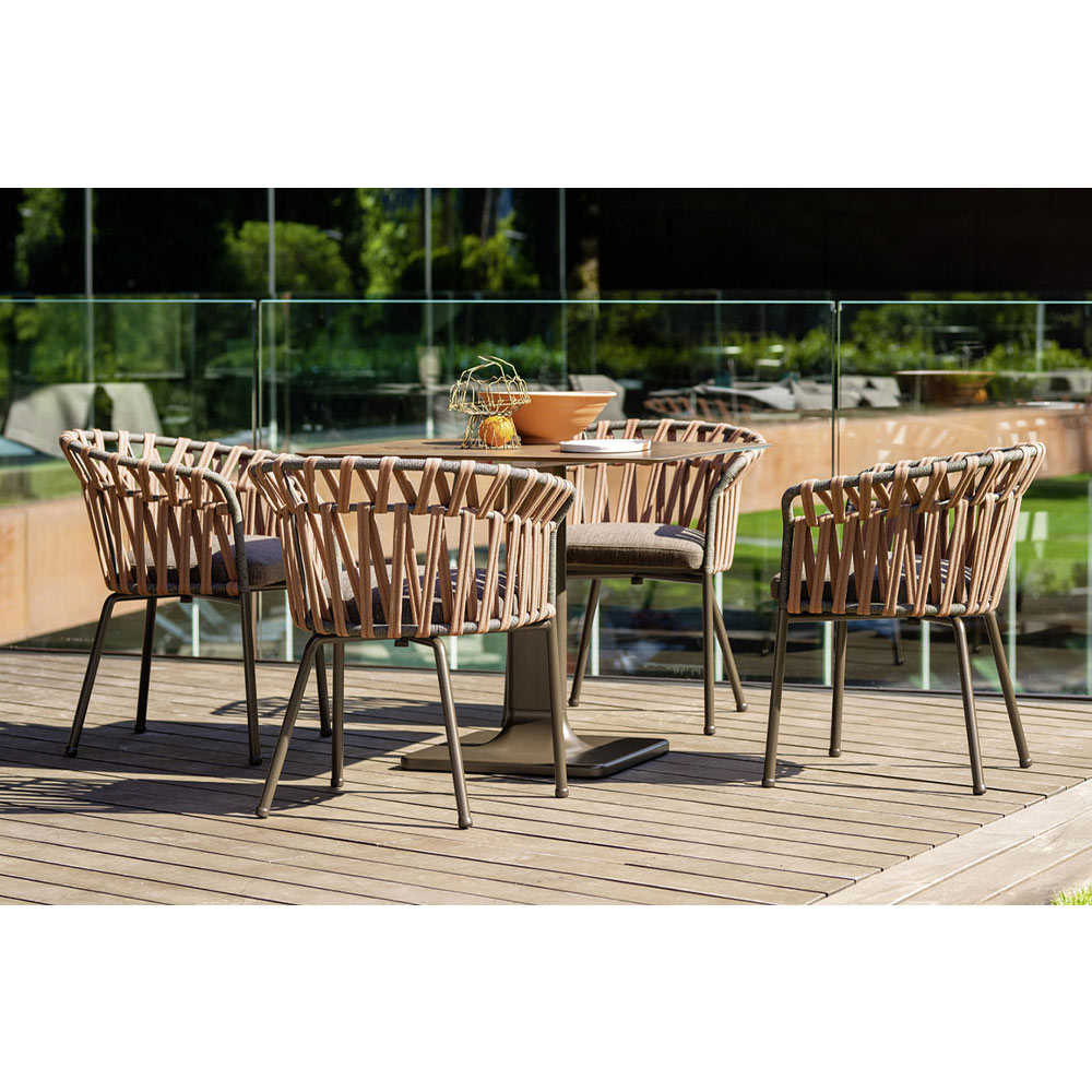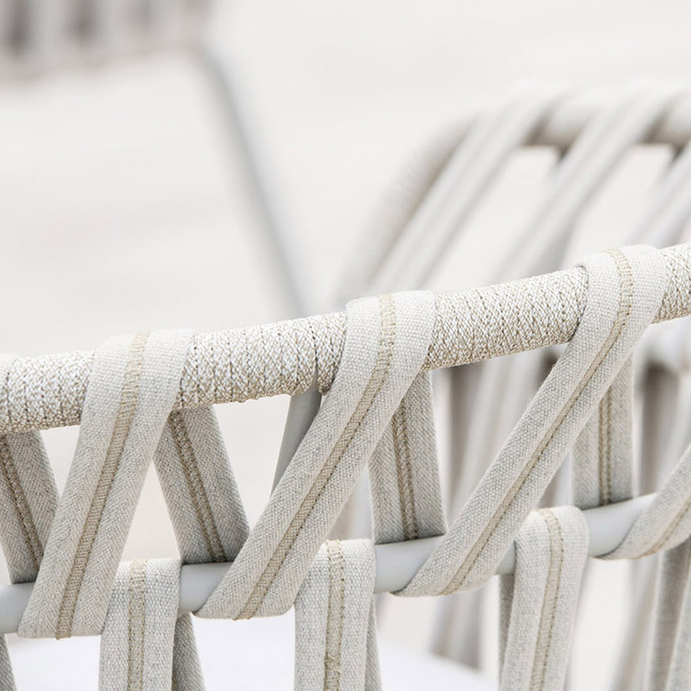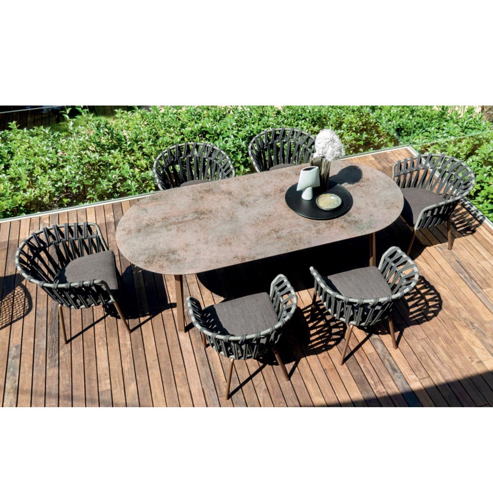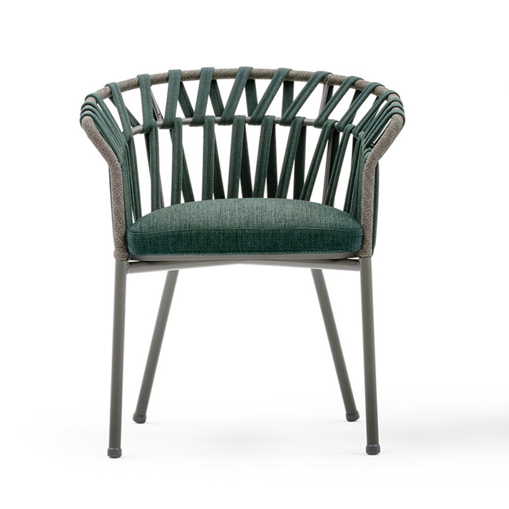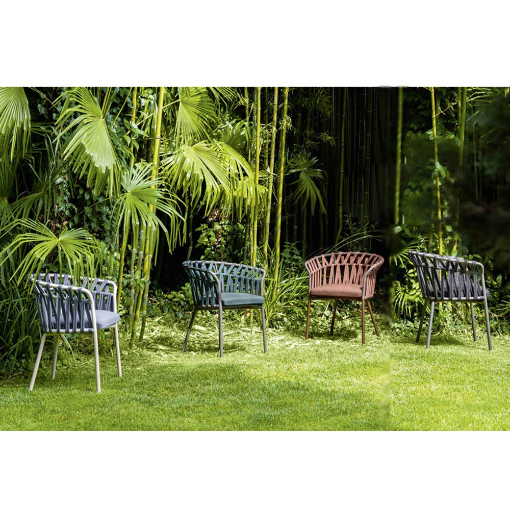 Sein Design ist von den eleganten und leichten Formen einer Blumenkrone inspiriert und wird durch das Gewebe einzigartig, das einem bestimmten geometrischen Muster folgt, das perfekt zu den zarten und einhüllenden Formen der Struktur passt, die willkommen und entspannend sind. Was entsteht, ist eine frische und innovative Einrichtungslösung, die durch wunderbar raffinierte Nuancen bereichert wird, dank derer sich die Natürlichkeit des Außenbereichs in zeitgenössische Eleganz verwandelt.