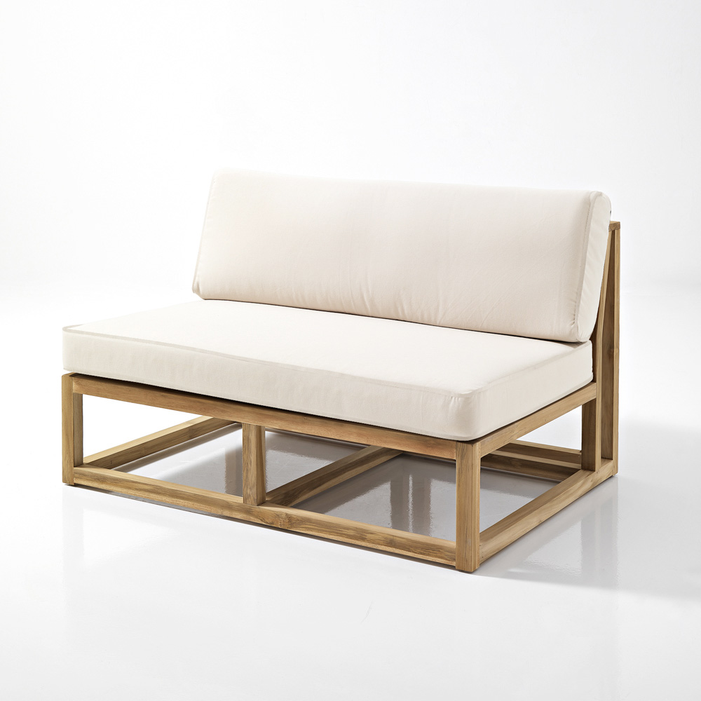Dieses Gartensofa ist ein wahrer Ausdruck von elegantem Minimalismus und modernem Komfort. Die Struktur aus natürlichem Teakholz zeichnet sich durch seine klaren Linien und seine Robustheit aus, die Dauerhaftigkeit und Widerstandsfähigkeit gegen die Elemente gewährleistet. Das geradlinige Design bietet einen modernen und vielseitigen Touch, der sowohl für den Außen- als auch für den Innenbereich geeignet ist.