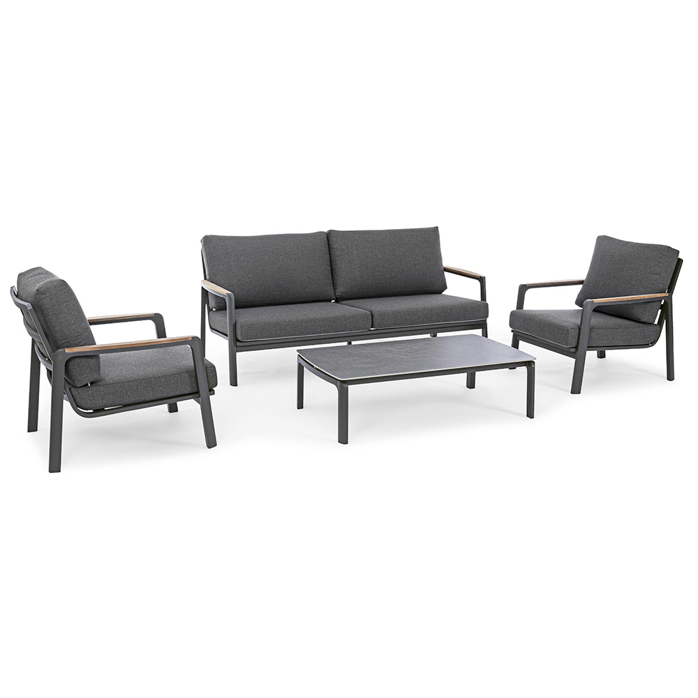 Pulverbeschichtete Aluminiumstruktur (Polyester). Armlehnen mit Teakholzeinsätzen . Sitz- und Rückenkissen mit abnehmbaren Bezügen aus Acrylgewebe .
