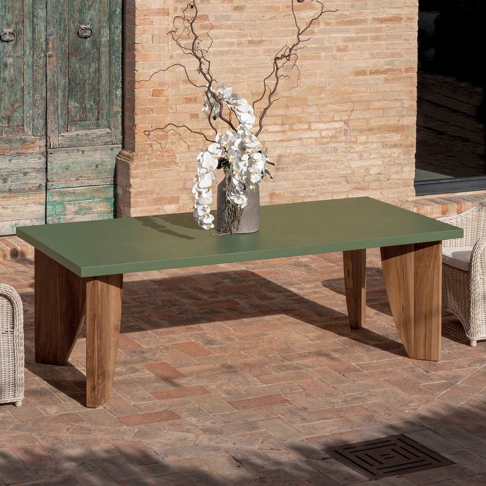 Tisch für drinnen und draußen aus Okumé-Marinesperrholz und Teakholz. Hergestellt in Italien.
