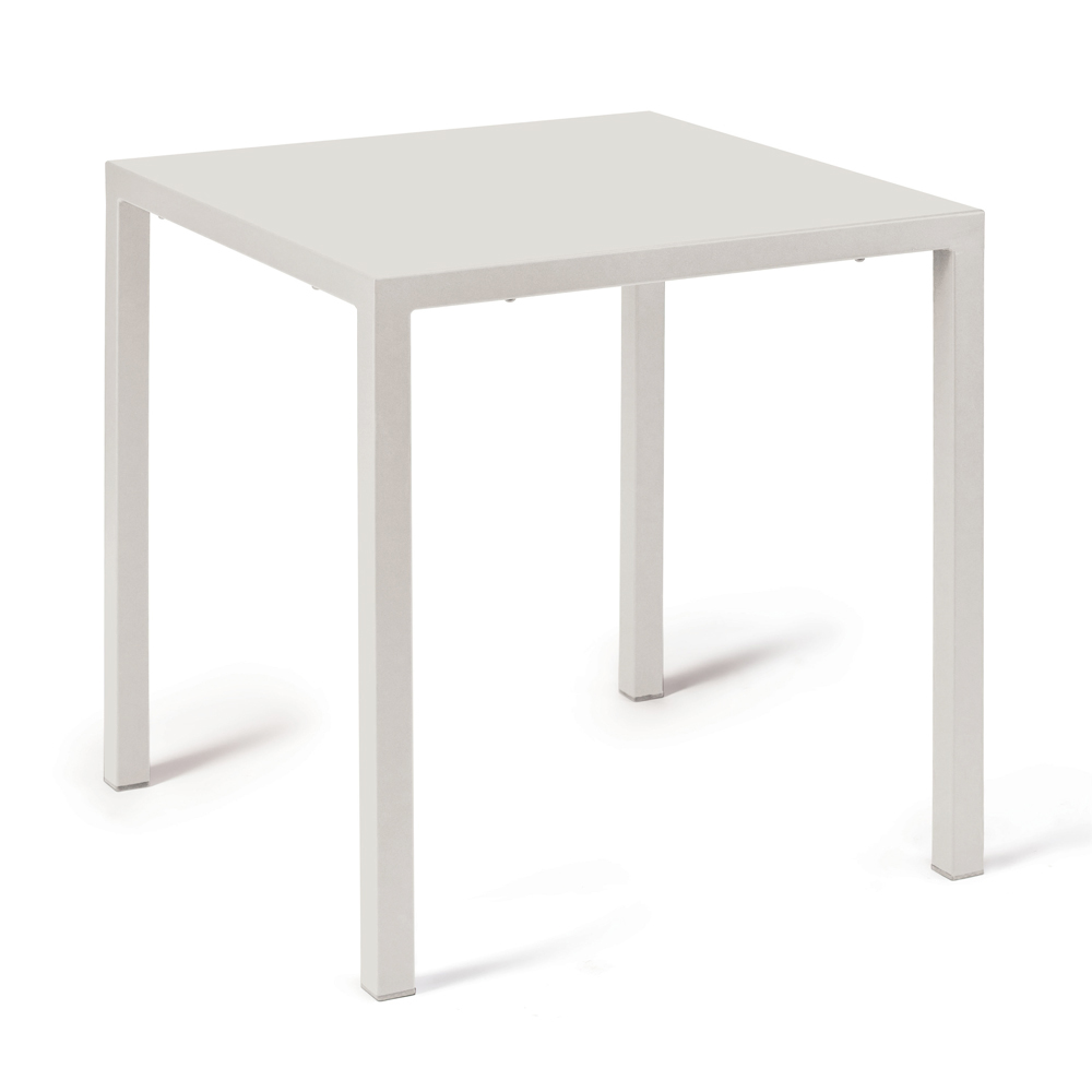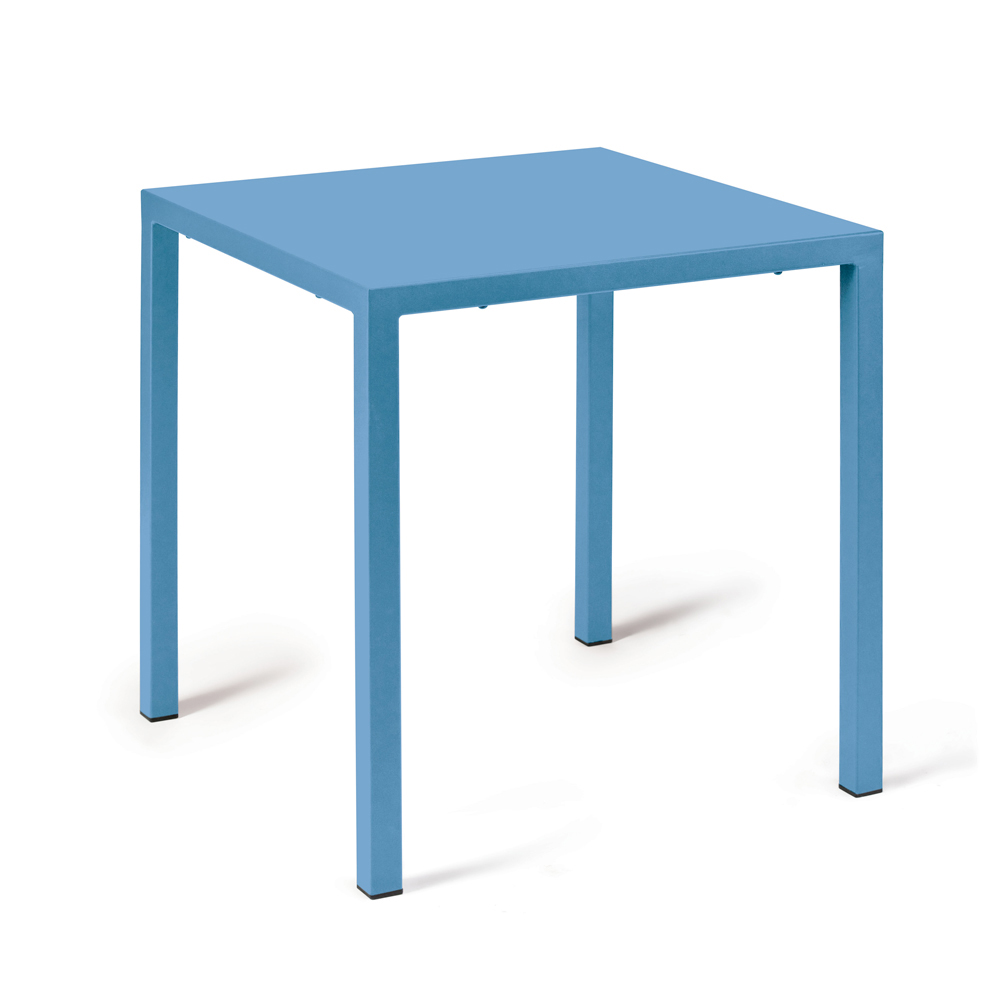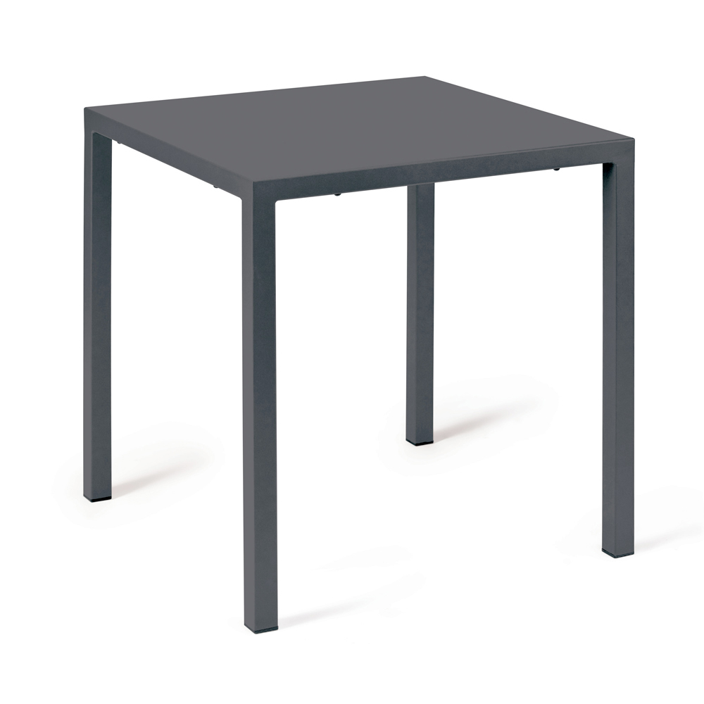 Stapelbarer und selbstnivellierender Esstisch für den Außenbereich. Hergestellt in Italien, komplett aus verzinktem Stahl mit quadratischen Beinen und 4 normalen Füßen.