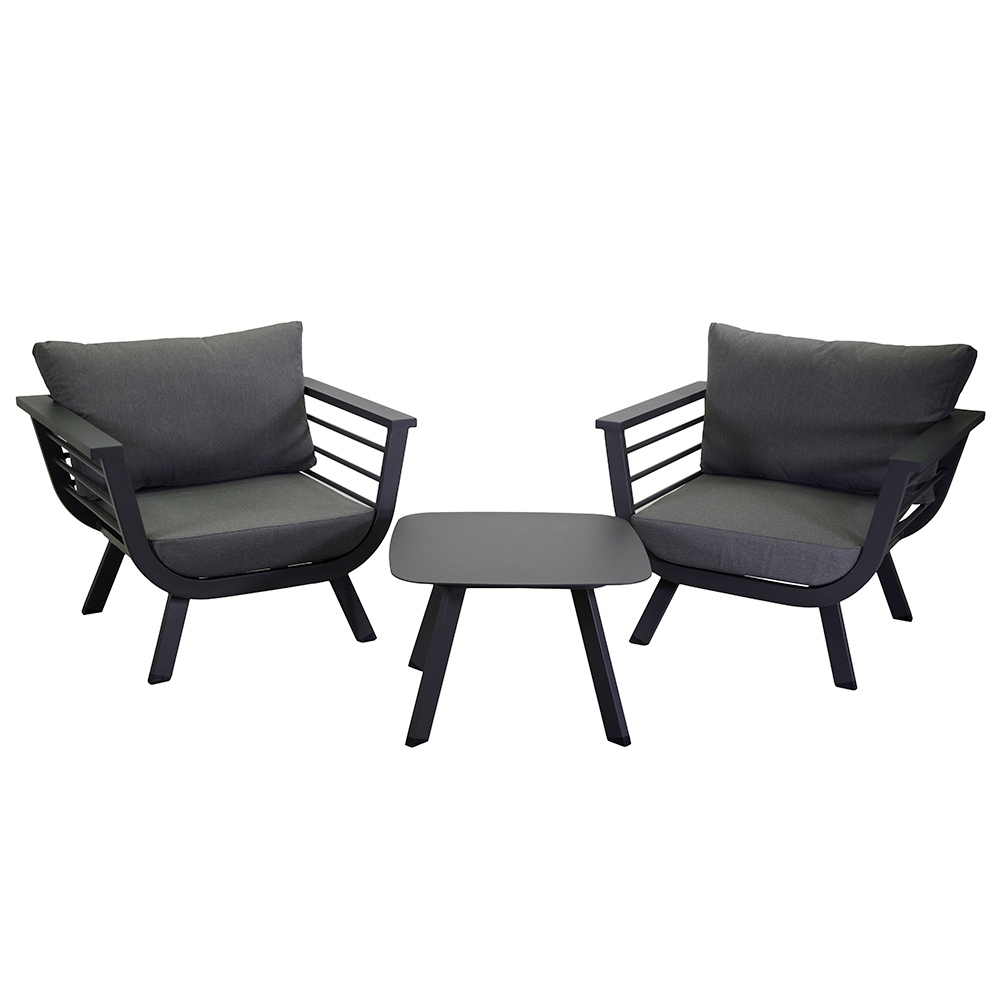 Das moderne Design der Sessel mit eleganten Armlehnen und die Robustheit des Aluminiums sorgen für Haltbarkeit und Stabilität und machen diese Lounge zu einer idealen Wahl, um unzählige Momente im Freien zu genießen.
