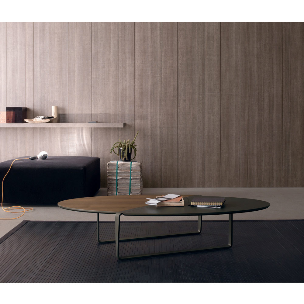 Ovaler Couchtisch aus Metall und zweifarbiger Holzplatte made in Italy.