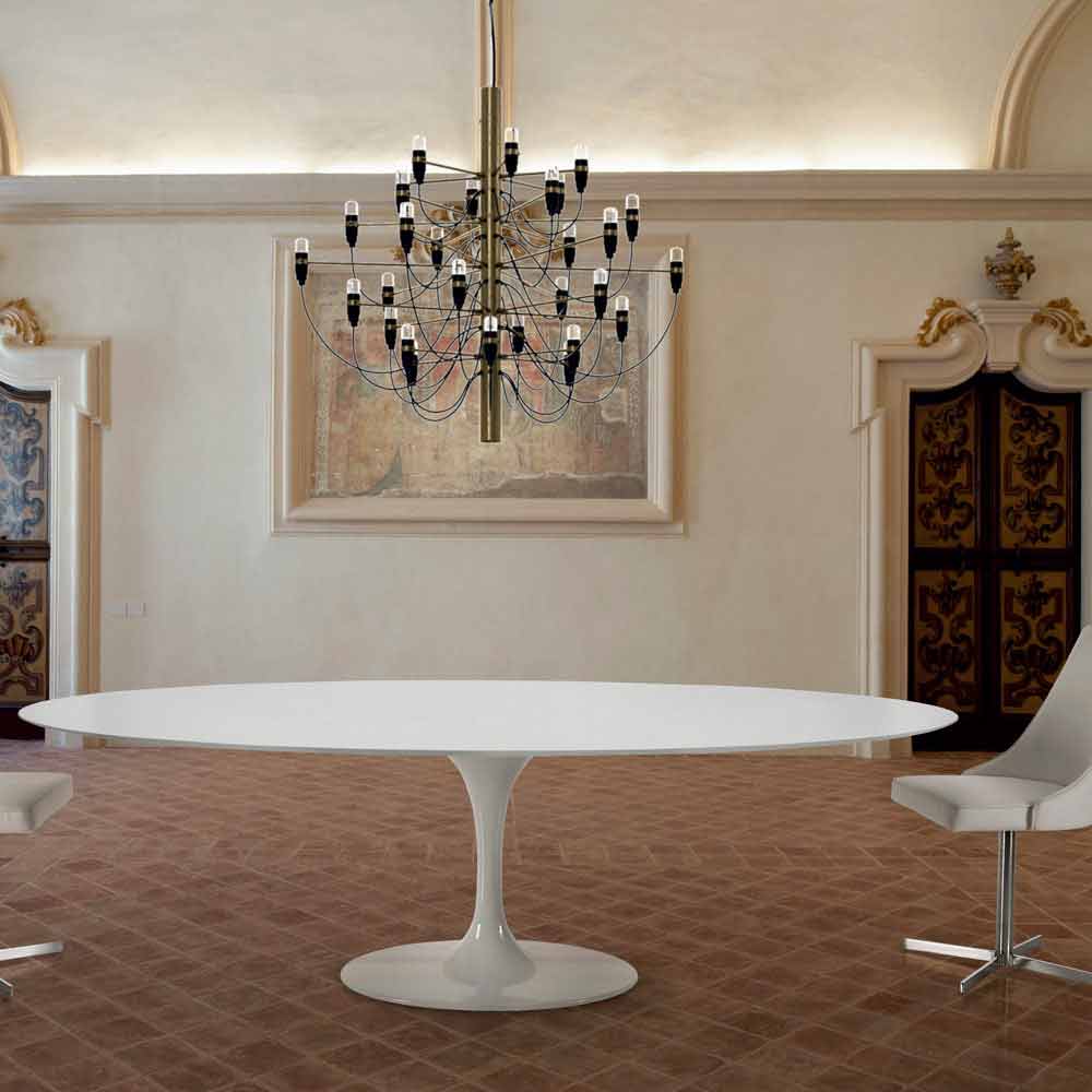 In Italien hergestellter Esstisch mit runder Platte aus flüssigem Laminat und Untergestell aus glänzend weiß lackiertem Aluminiumguss . Ein Einrichtungsaccessoire mit exklusivem Stil , das sich durch eine äußerst elegante und moderne Persönlichkeit und einzigartige Merkmale auszeichnet, die seine Qualität und seinen Wert unterstreichen. Seine raffinierte Ästhetik zeichnet sich durch die originelle ovale Form der Platte und die besondere Form des Untergestells aus, die die Einzigartigkeit dieses wunderbaren Esstisches verkörpern. Neben der starken visuellen Komponente weist es auch eine starke funktionale Seite auf, die durch die Verwendung hochwertiger Rohstoffe unterstrichen wird, die eine solide und widerstandsfähige Auflagefläche gewährleisten.
