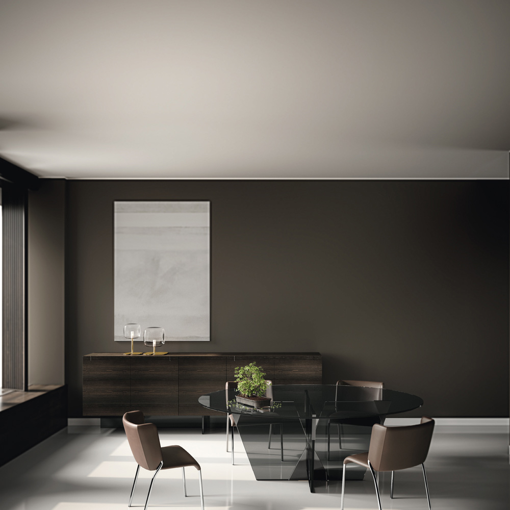 Esstisch mit ovaler Platte und hochwertigem Made in Italy Glasfuß.