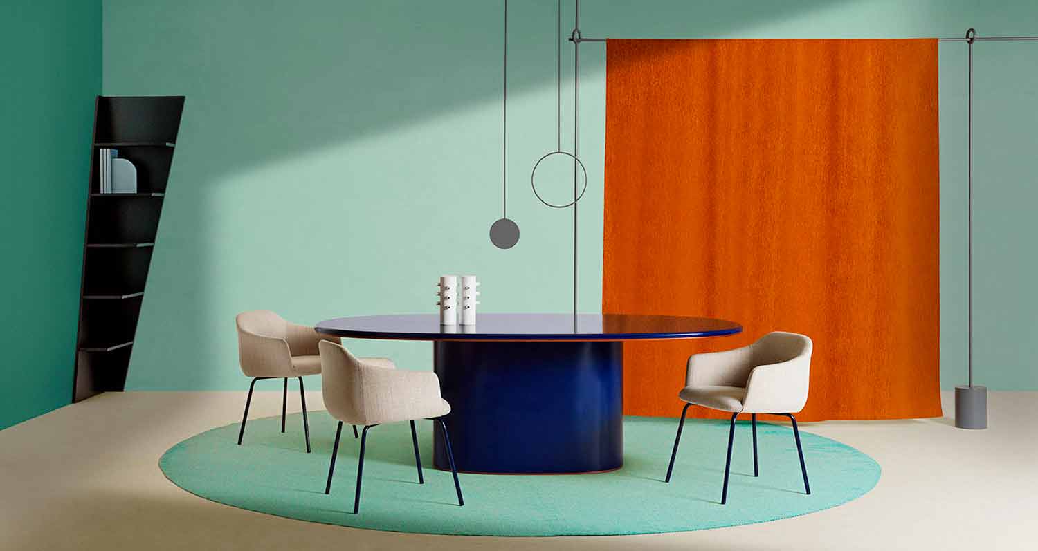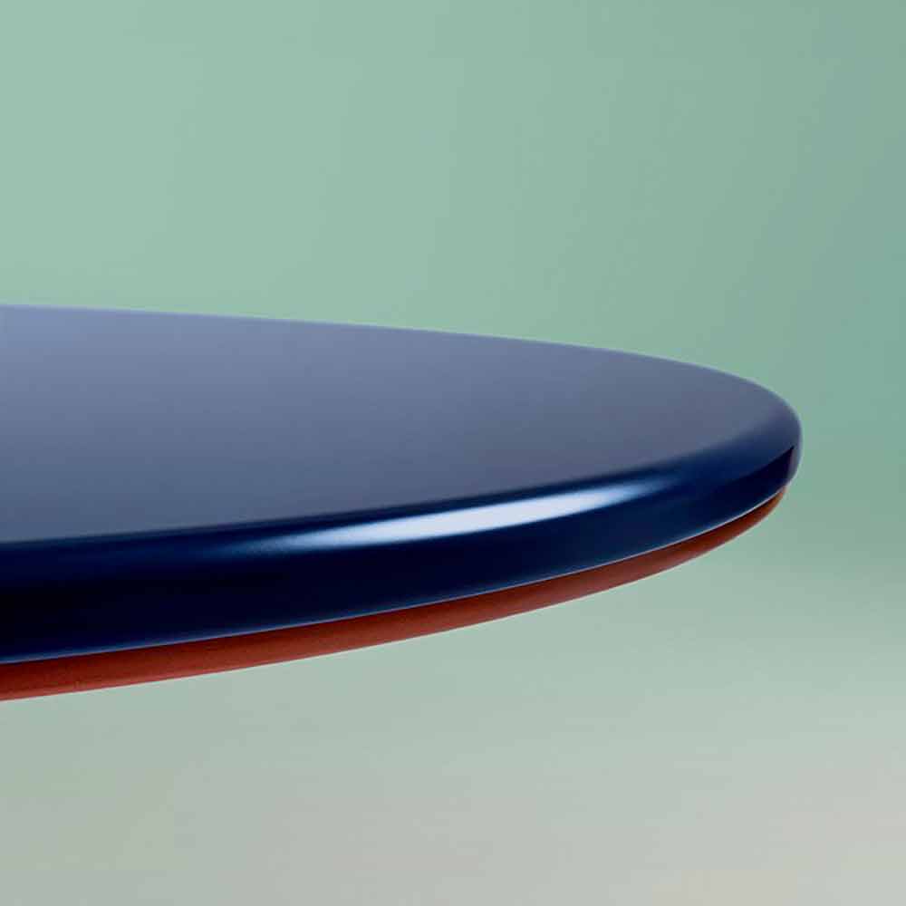 Ovaler Esstisch aus blau lackiertem MDF mit Kupferdetails in modernem und originellem Design, hergestellt in Italien.