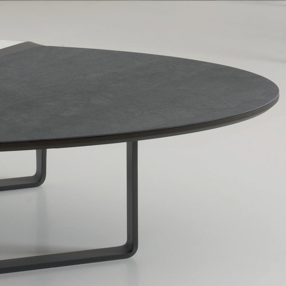 Dieser Couchtisch im ovalen Design verfügt über einen geprägten graphitpulverbeschichteten Metallfuß und eine zweifarbige matte Keramikplatte auf Tafel.