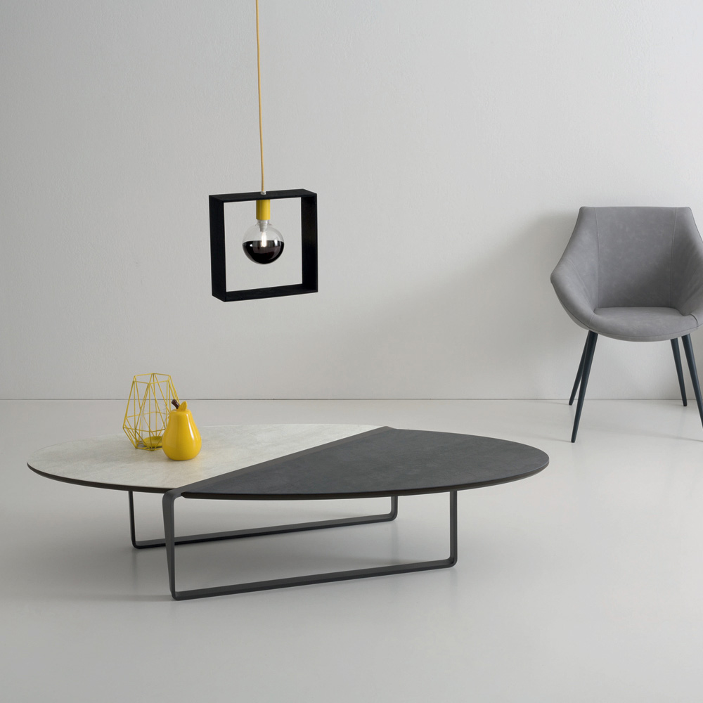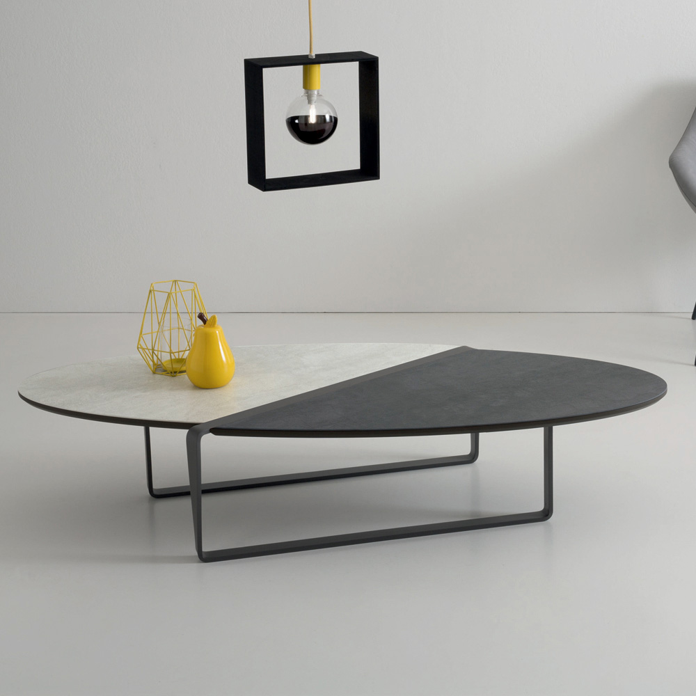 Ovaler Couchtisch aus Metall und zweifarbiger Keramikplatte made in Italy.