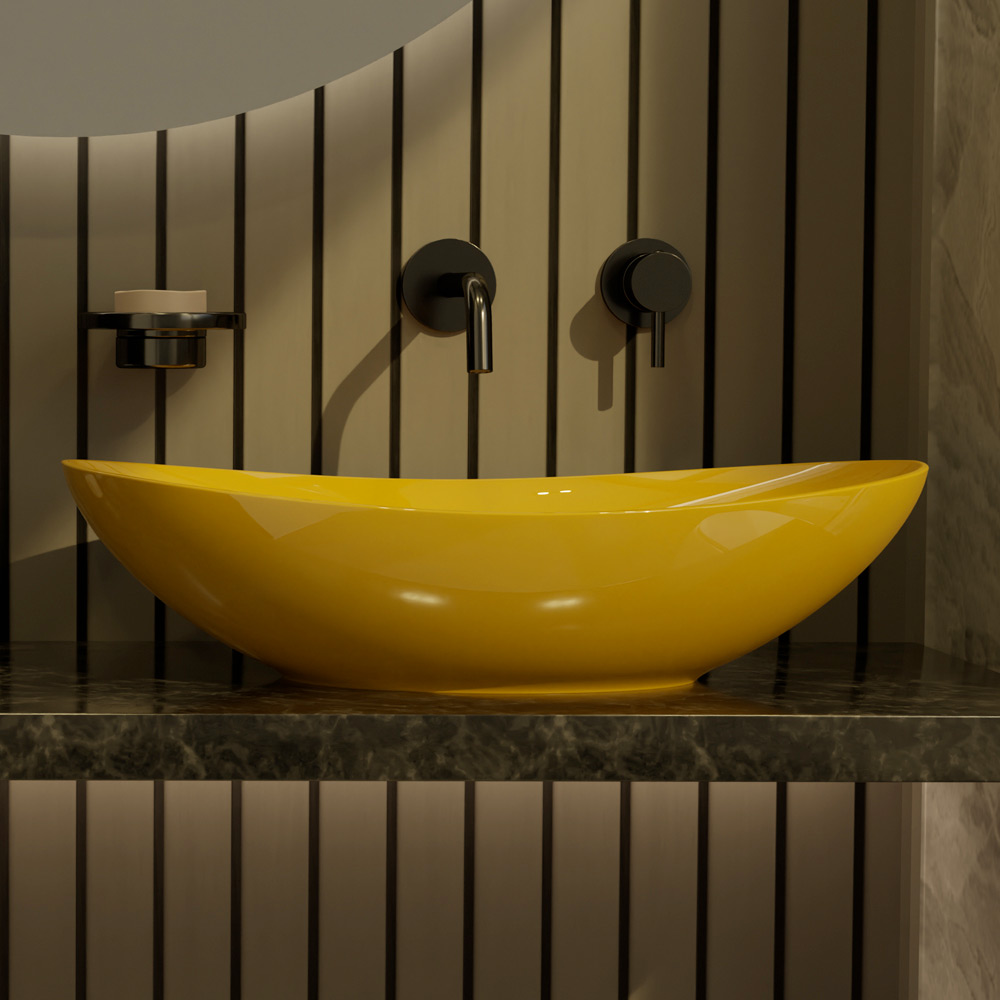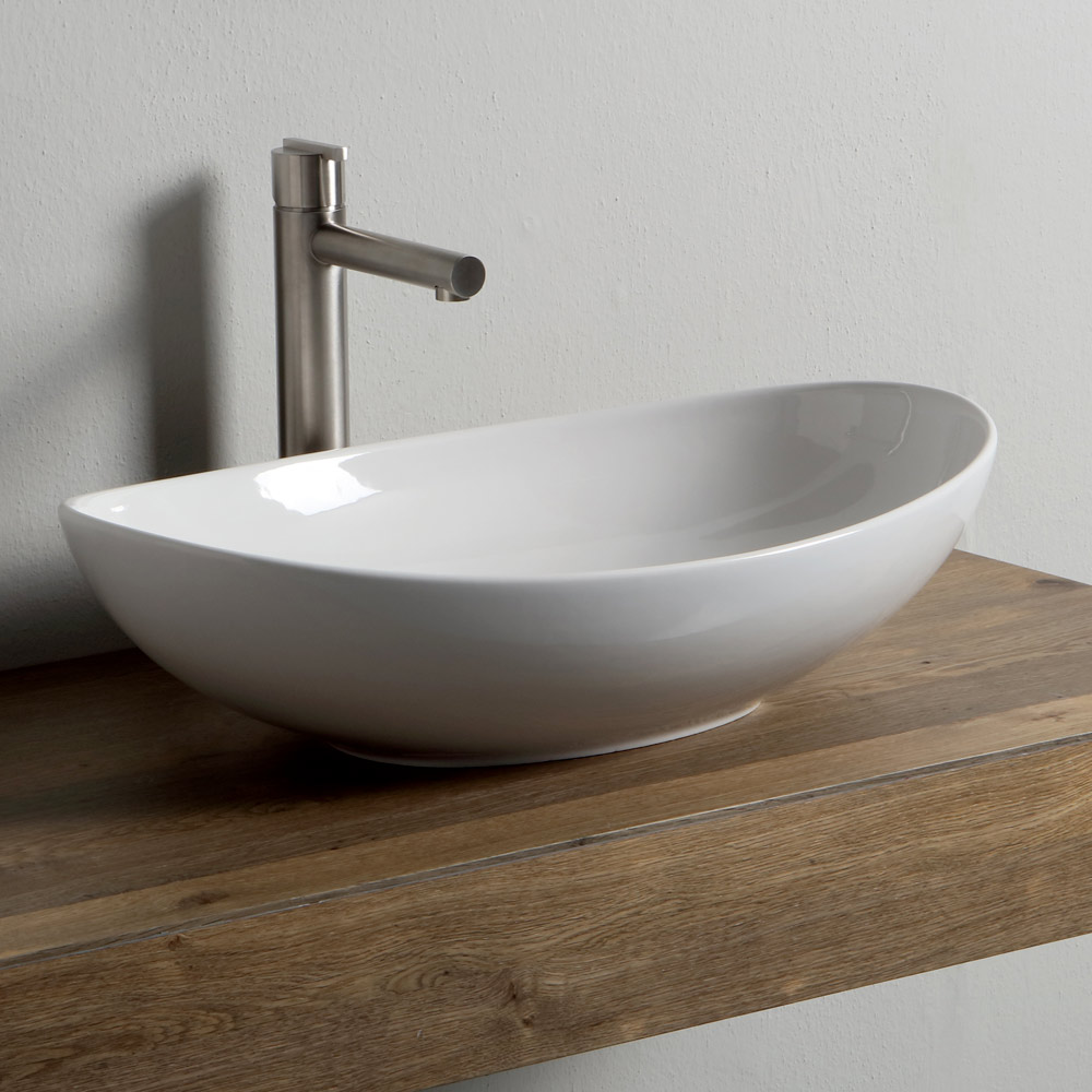 Ovales Aufsatzwaschbecken aus glänzender oder mattfarbiger Keramik , handwerklich in Italien hergestellt . Geschwungene und harmonische Linien beleben ein modernes und avantgardistisches Design für diejenigen, die einen einfachen und vielseitigen Stil lieben, ohne auf eine originelle Note in ihrem Badezimmerbereich zu verzichten.