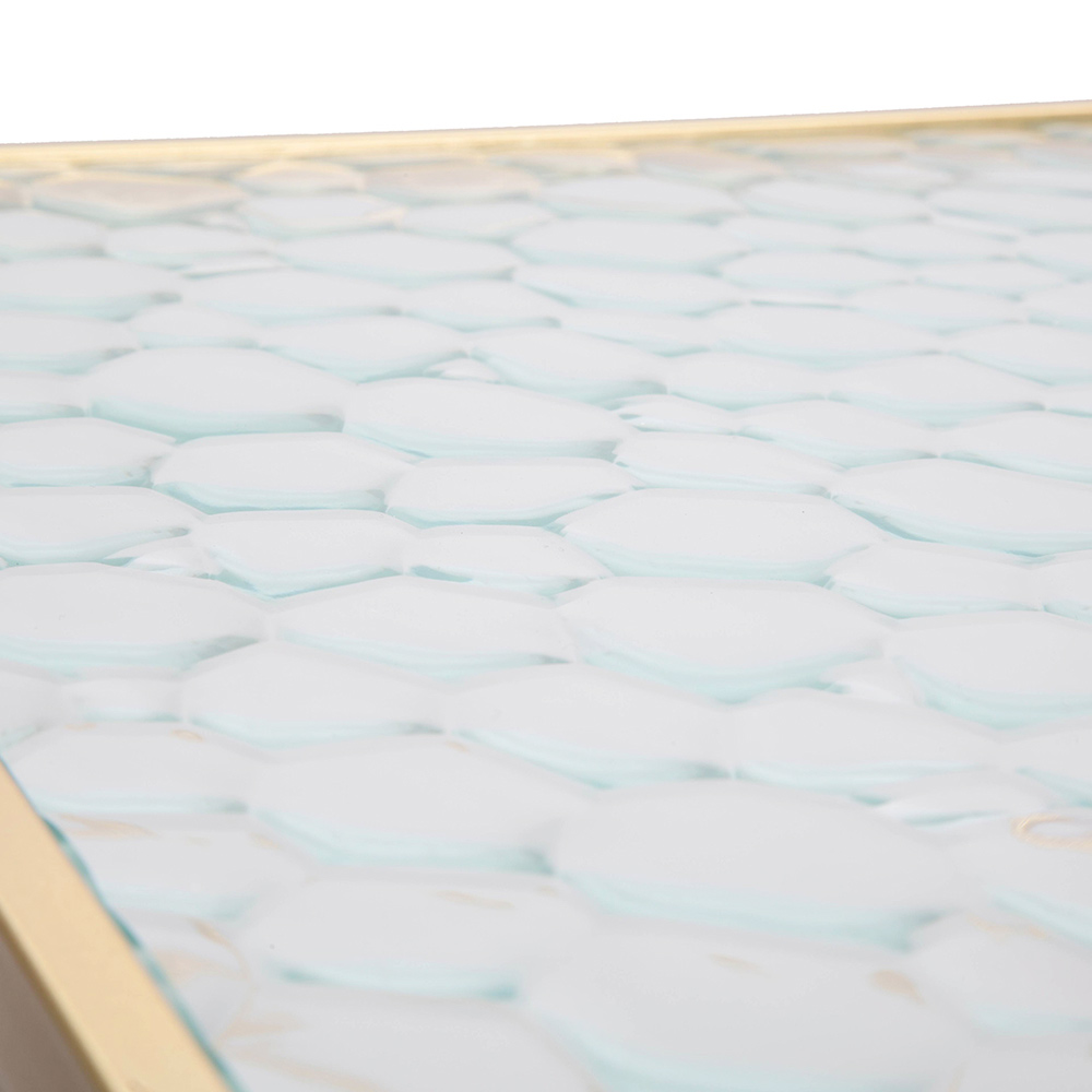 Diese Couchtische sind wahre Designjuwelen, die künstlerische Finesse mit struktureller Solidität verbinden. Ihr goldener Metallsockel bildet ein Gitter aus geometrischen Linien, die sich in einem visuellen Ballett aus Formen und Volumen verflechten und einen dreidimensionalen Effekt erzeugen, der fast skulptural ist.