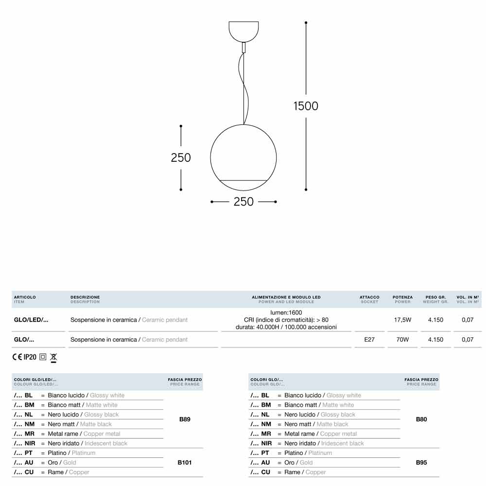 Designer Keramik-Pendelleuchte Globo von Aldo Bernardi , erhältlich mit Fassung für Glühbirne E27 oder mit LED.